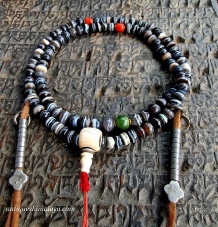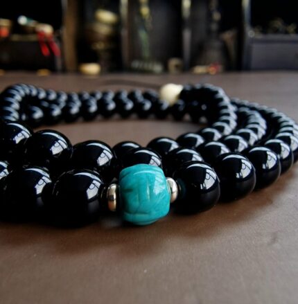 Antique Tibetan Mala - 108 Black Agate & Turquoise, a traditional Tibetan Mala (prayer bead string) consisting of 108 beads, used for mantra recitation and meditation.