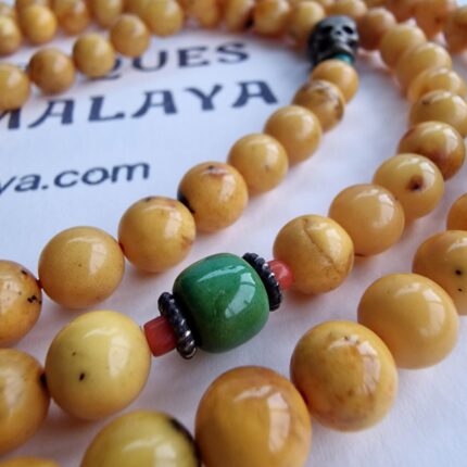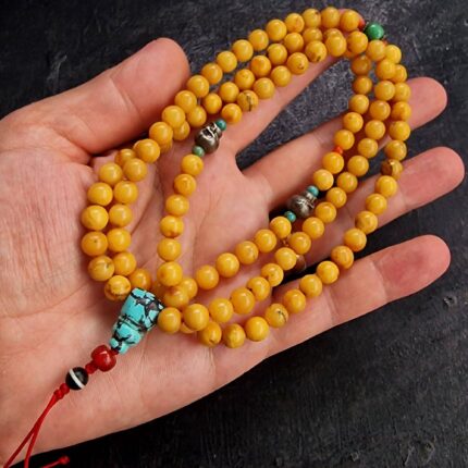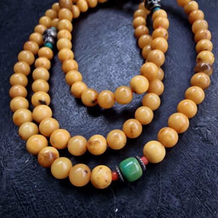 Tibetan Natural Amber Prayer Beads Mala - Egg Yolk Yellow, a complete and rare 108-bead Tibetan prayer mala crafted from natural, high-quality amber. The beads feature a beautiful, sought-after opaque egg yolk yellow color, characteristic of fine natural amber
