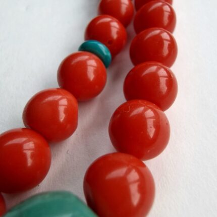 📿 A superb and rare Tibetan Coral prayer 108 beads necklace This is a striking example of a mala that beautifully captures the aesthetic of high-end Himalayan prayer beads while remaining accessible. The high quality "enhanced coral" and resin components are very common in traditional Tibetan craftsmanship, where the spiritual intent and visual symbolism of the color is valued along the stone. Key Features & Symbolism * Aka Coral Aesthetic: The "Aka" (Deep Red) coral is the most prized variety in Asian markets. By using enhanced coral, you achieve that deep, meditative red—symbolizing compassion and life force—without the high cost of natural deep-sea coral * The 108 Count: This is a sacred number in Buddhism, representing the elimination of 108 types of desire/afflictions. * Guru Bead (The Yellow Resin): The larger yellow bead is the "Guru Bead" or "Mother Bead." It signifies the teacher and the end of a chanting cycle. In Tibetan tradition, you never cross over the Guru bead; you turn the mala around and go back the other way. * Turquoise/Green Accent: The green bead serves as a "spacer" or marker. In Tibetan culture, red coral and turquoise are the most auspicious pairing, representing the balance of sky (turquoise) and earth (coral). Details | Bead Size | 9mm (Standard size for comfortable daily meditation | Total Length | 40cm (Folded), likely 80cm total circumference | | Materials | High quality, enhanced coral and turquoise stabilized beads, traditional resin | Age | Vintage * Skin Oils and use are Good: Traditional malas actually benefit from the natural oils of your skin over time; they will develop a soft "patina" or glow as you use them. #TibetanTurquoise #AntiqueBead #HimalayanHeritage #SpiritualAdornment #HealingEnergy #RareTreasures #SacredStones #JewelryDesign #AncientWisdom #EnergyBalance 💎🌿🕉️ B 8/IT3