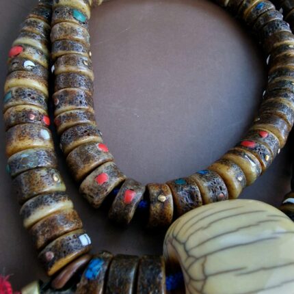 * The main strand consists of authentic skull bone beads, each intricately adorned with hand-inlaid white metal, copper, shell, and coral.