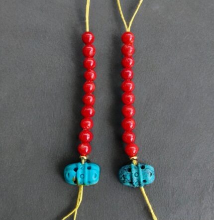* Material: Rudraksha beads, skull Kapala, turquoise accent beads, Guru bead, and leather red cord.