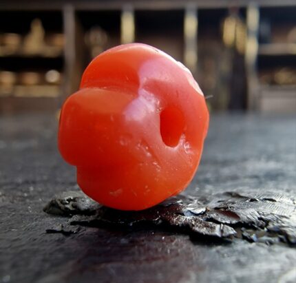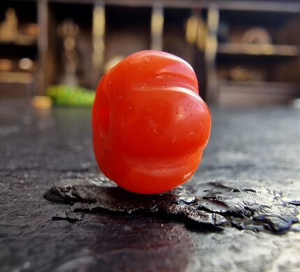 This extraordinary ancient Pema Raka bead, dating back over 1500 years, is hand-carved in the traditional melon shape and emanates a powerful presence. With its vibrant natural color and sacred energy, this coral bead has long served as a symbol of vitality, protection, and spiritual authority in Tibetan culture. A truly museum-grade relic, collected in Tibet and passed down through centuries of Himalayan devotion.