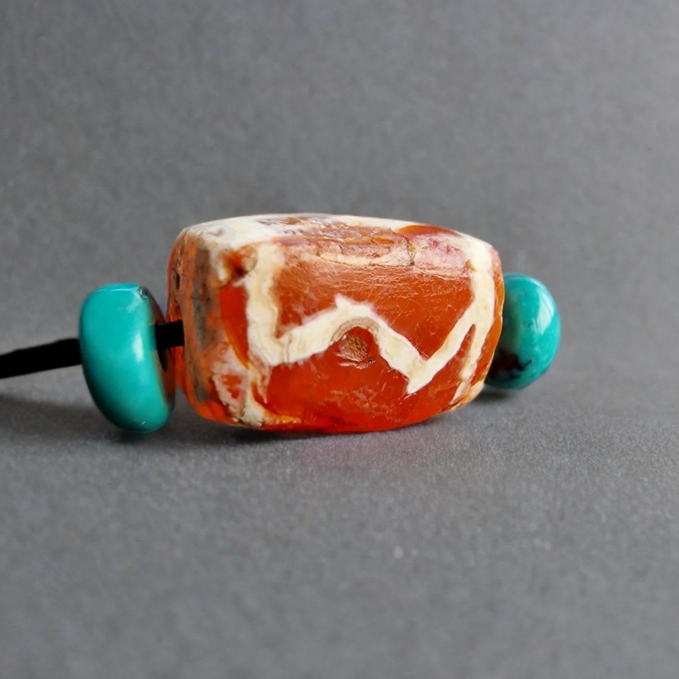 * The central bead is beautifully flanked with old turquoise spacers and is mounted on a string, ready for wear.