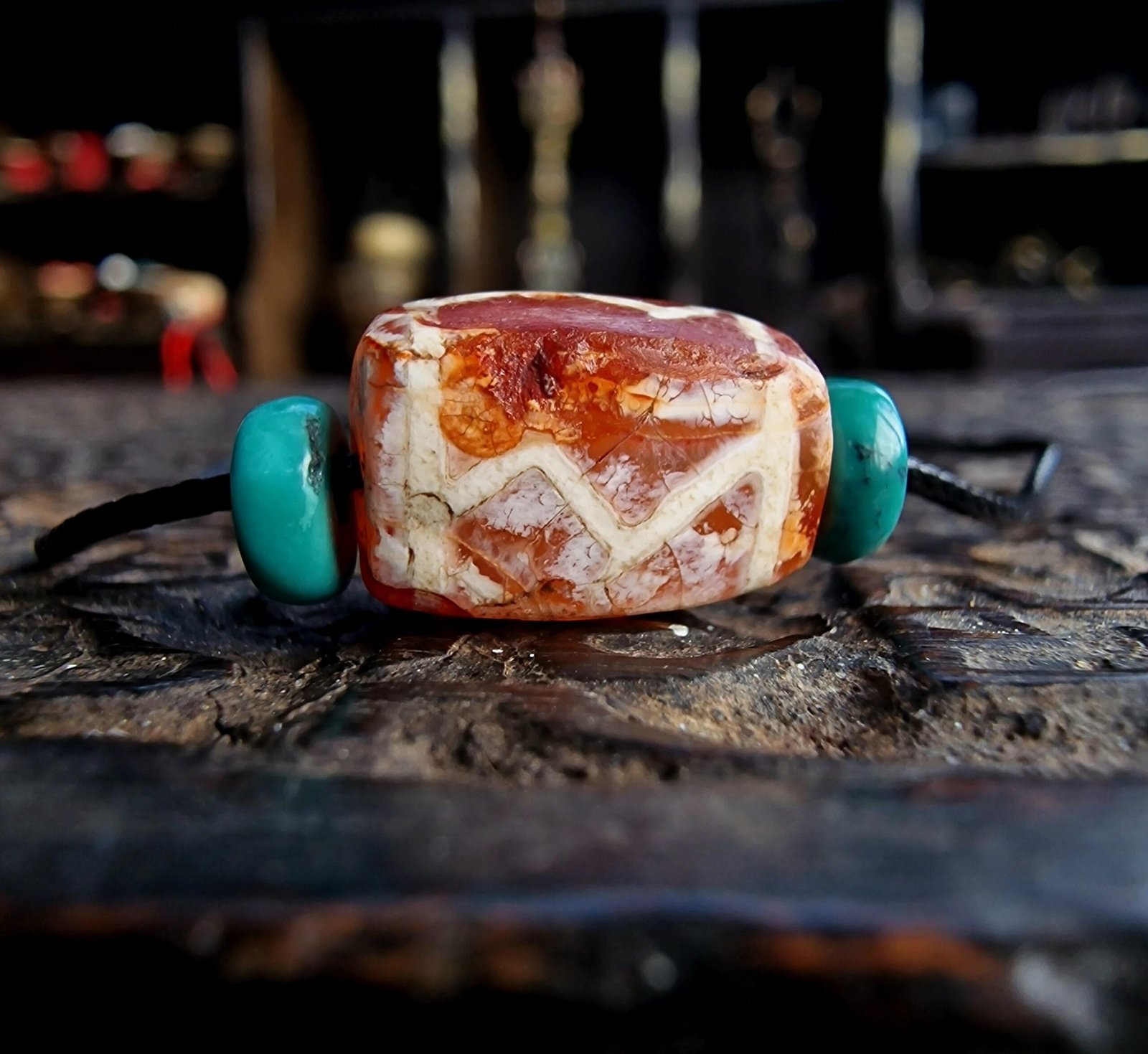 * Turquoise Guardians: The flanking turquoise beads serve as classic Tibetan protective talismans, balancing the fiery energy of the carnelian with the “Sky Stone’s” healing and calming properties.
