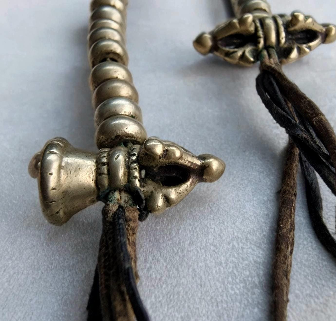 * The beads and ritual charms remain on their original aged leather cords, showcasing a rich, authentic patina from years of devotional use.