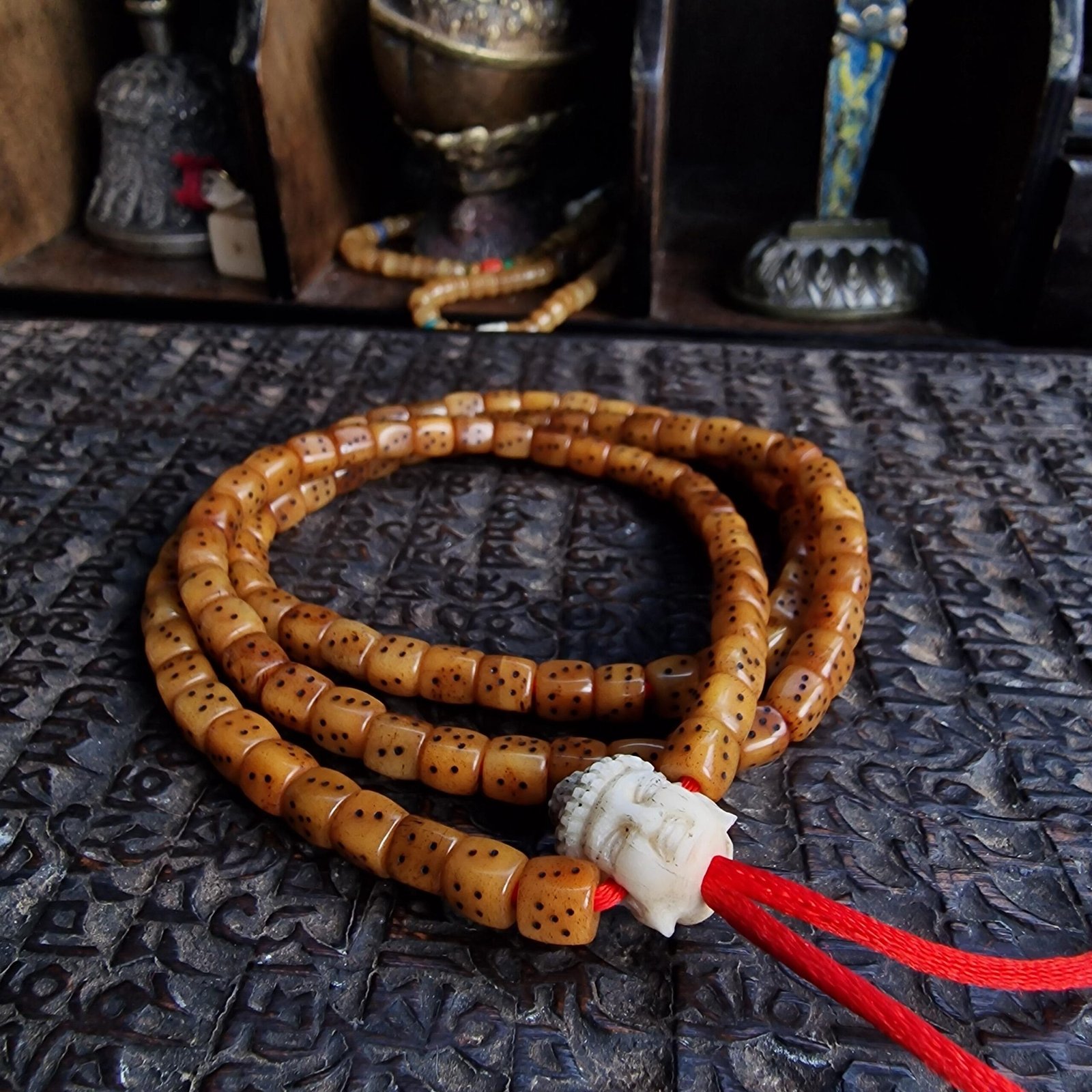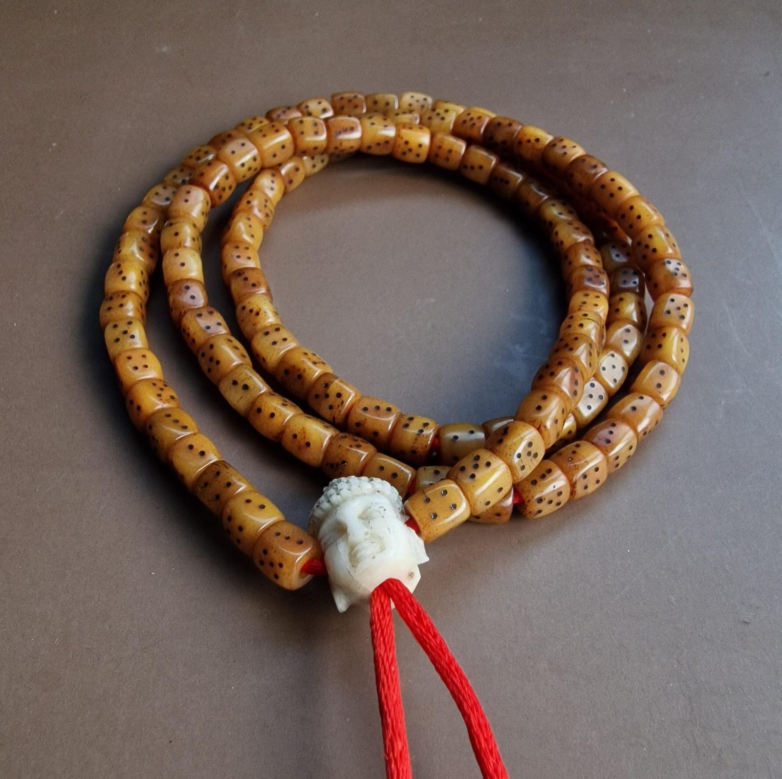 ◇ A complete hand made dice mala finished with a hand carved Buddha head. The mala features 108 beads and is displaying a beautiful patina and a tangible spiritual energy.