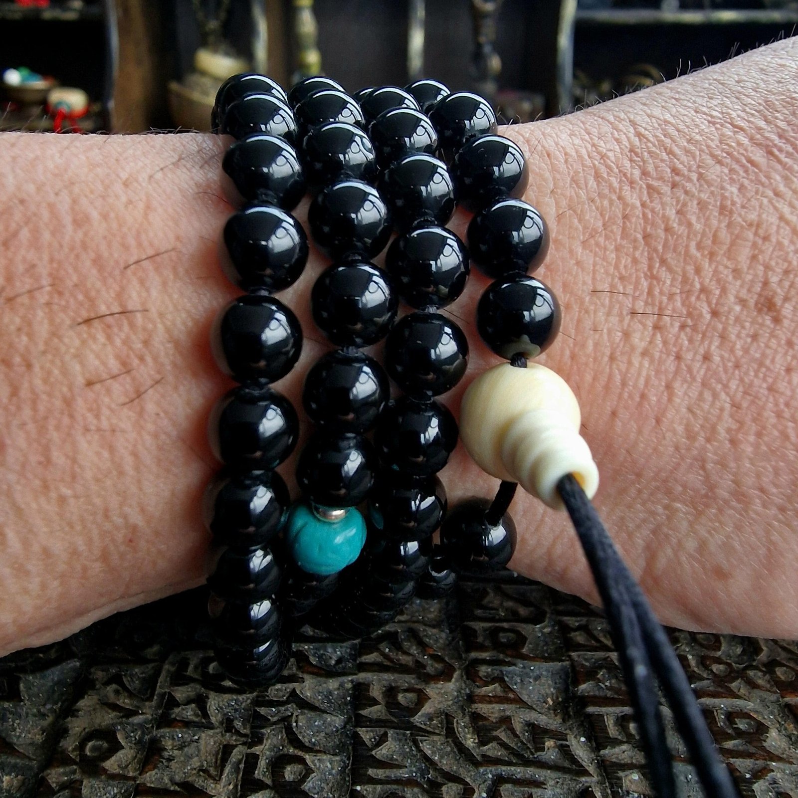 Acquire This Authentic Tibetan Black Agate & Antique Turquoise Mala – Shop Now!