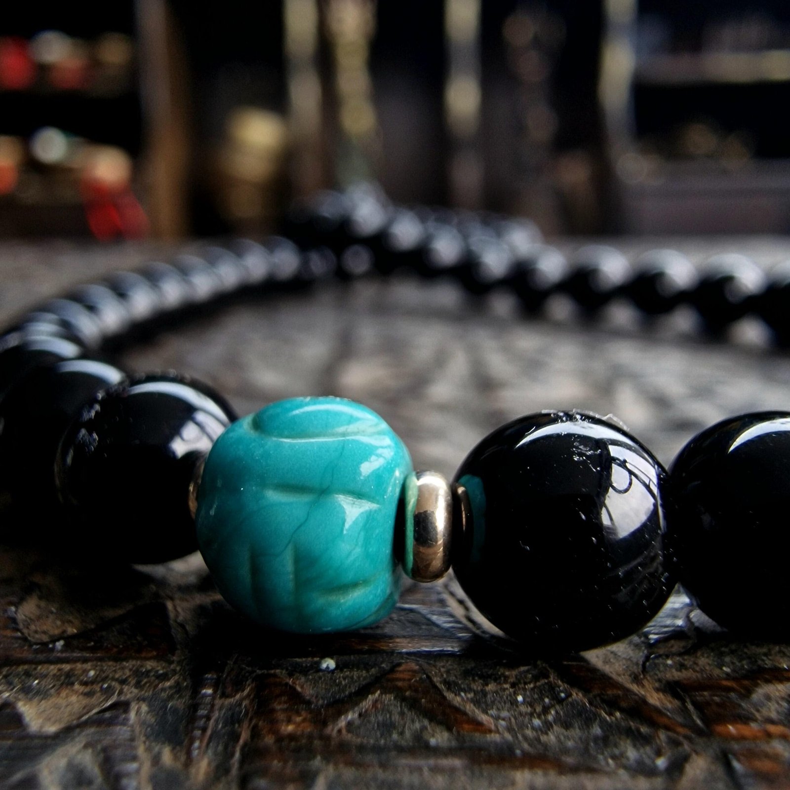 * A standout feature is the antique turquoise spacer bead, which is hand-carved and heavily worn from extensive ritual use.
