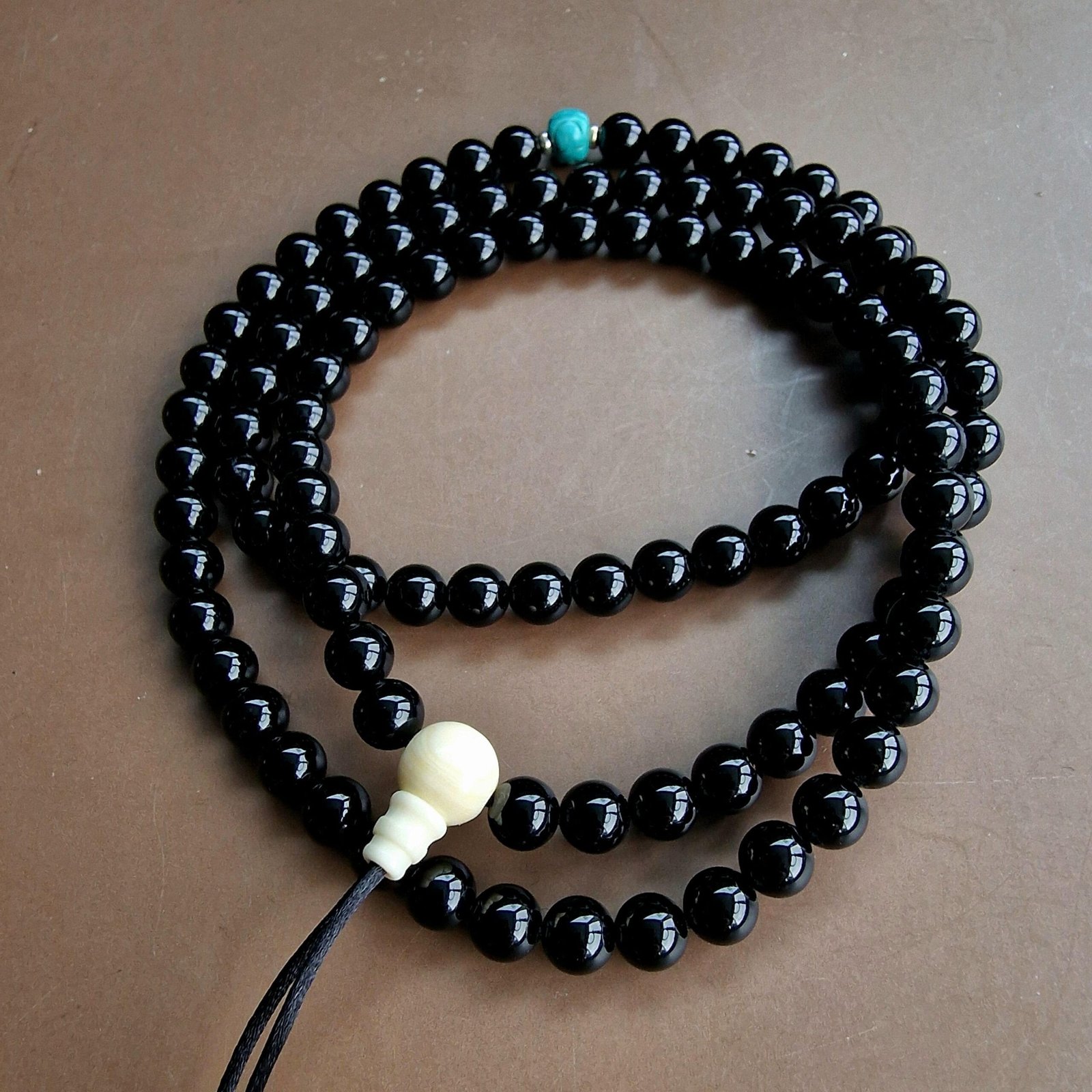 * is composed of 8mm black agate beads.