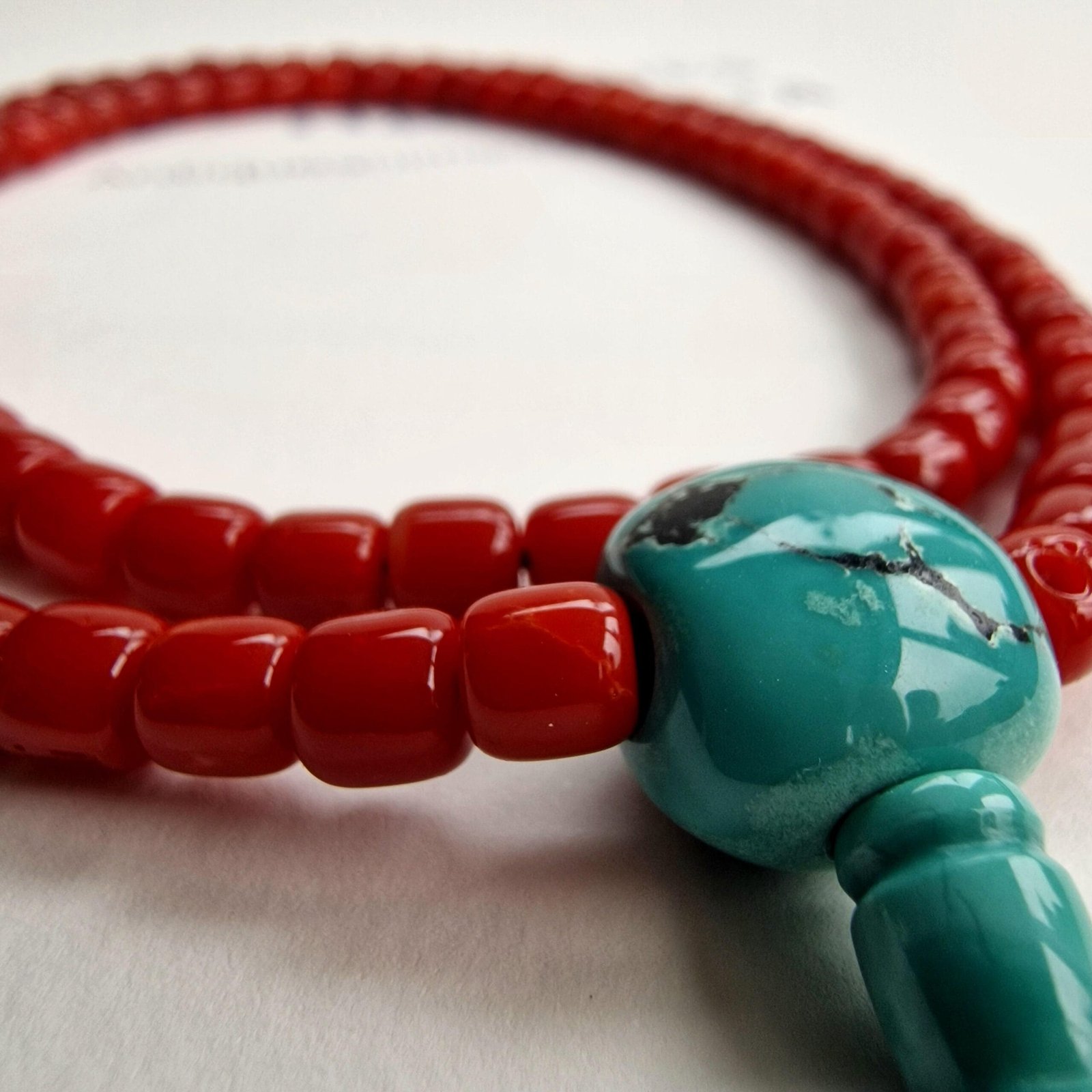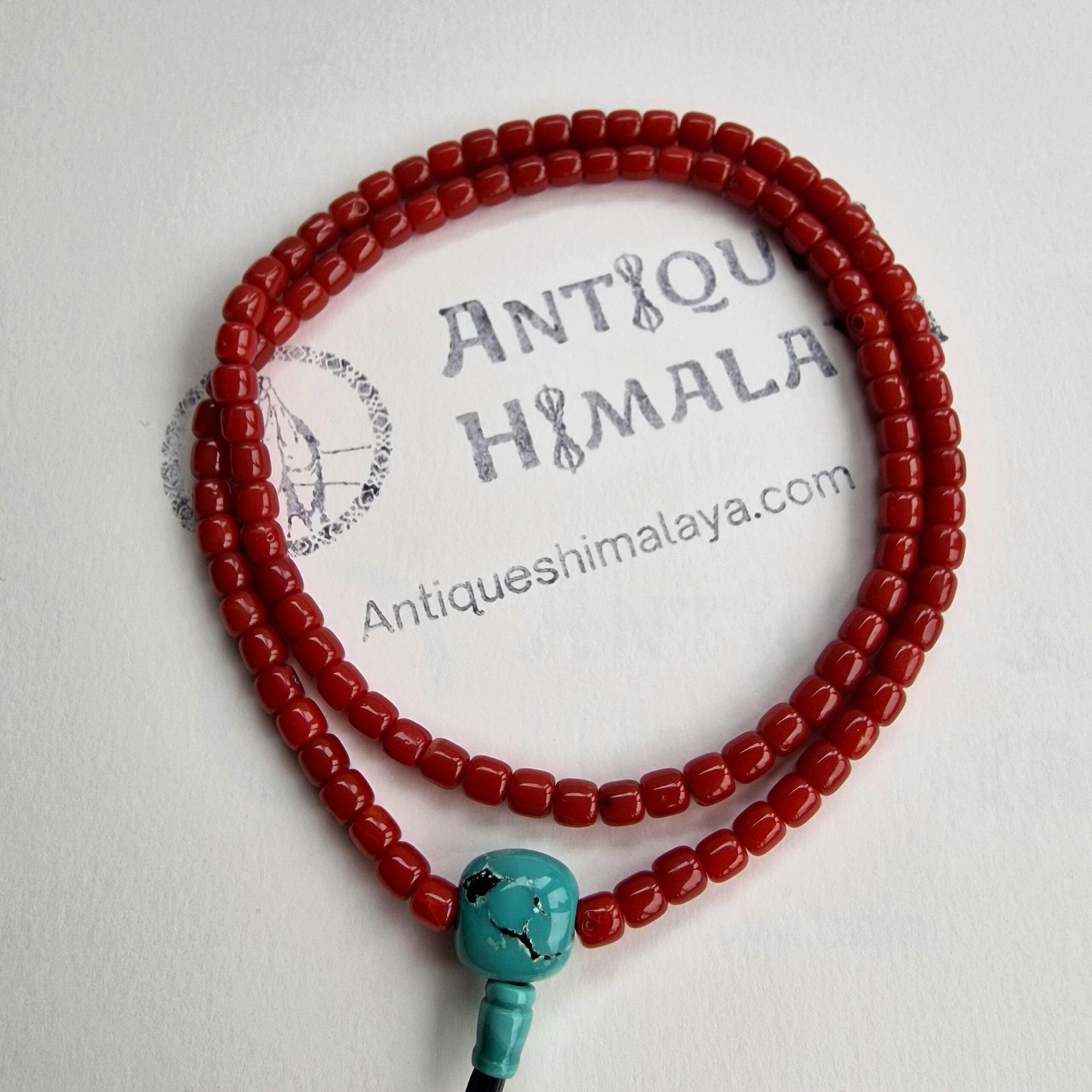 📿 Red Coral Tibetan Mala – 108 Beads with Natural Turquoise Guru