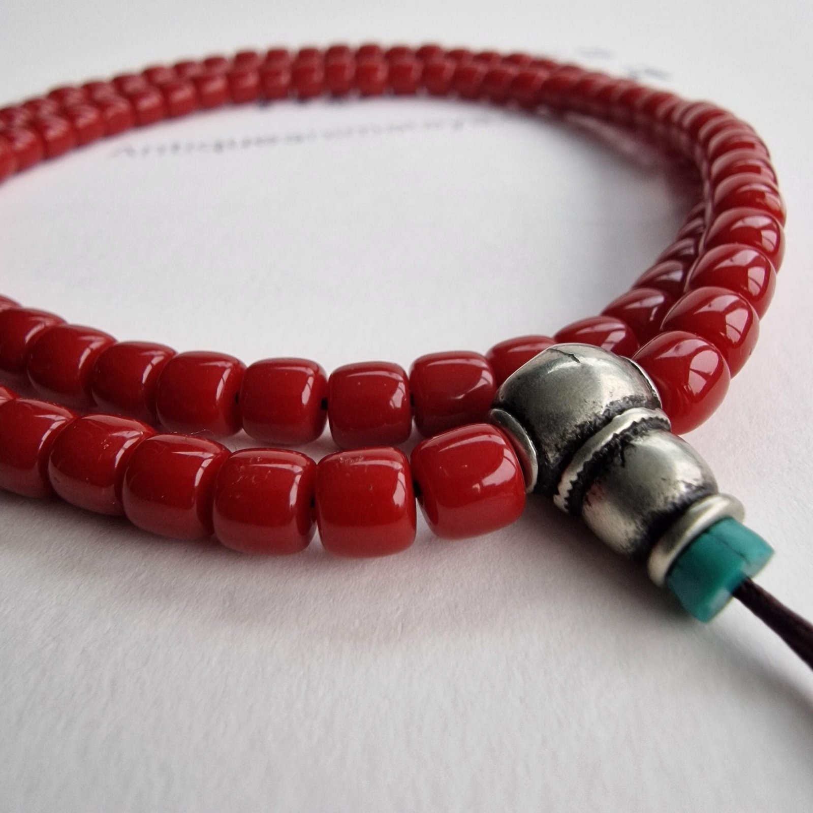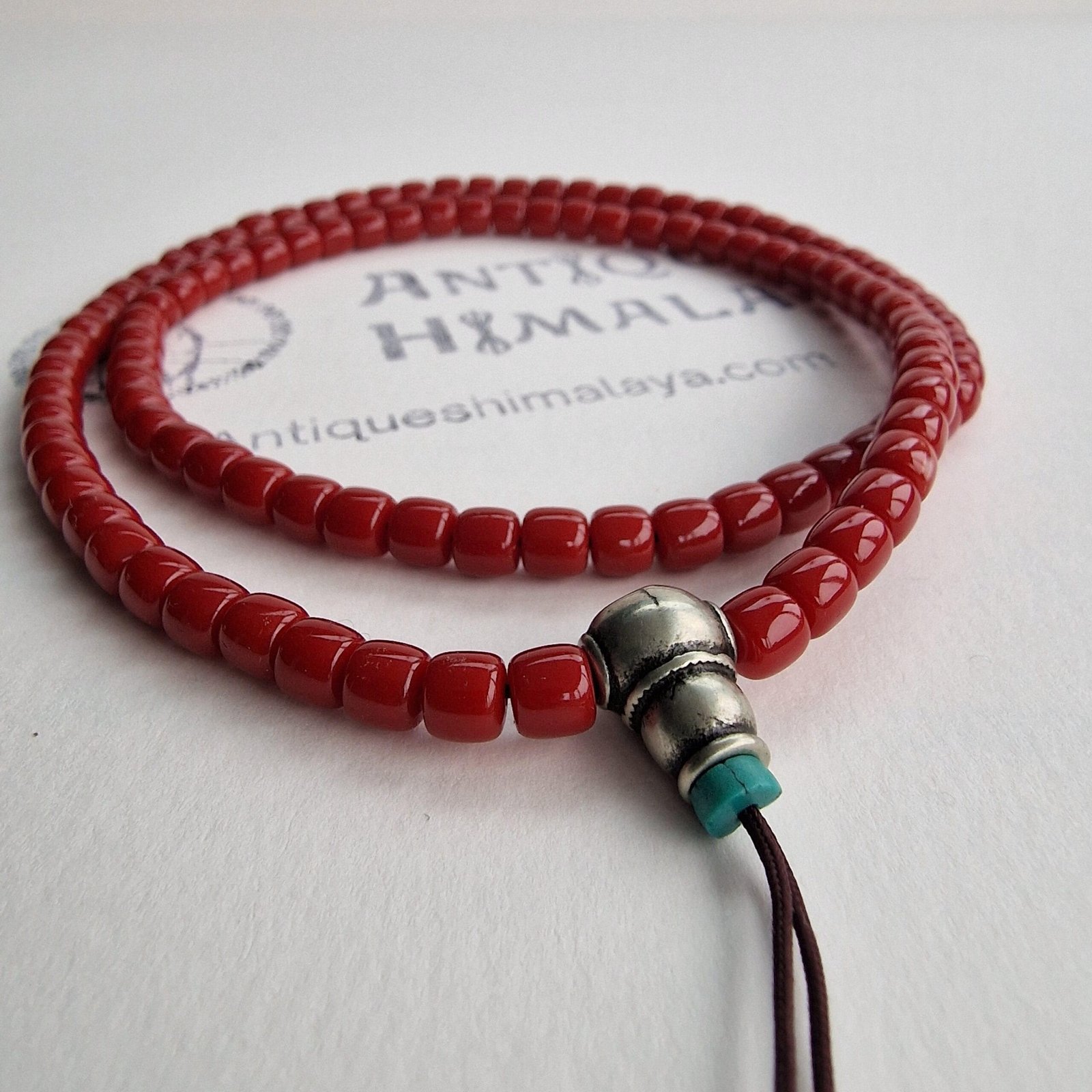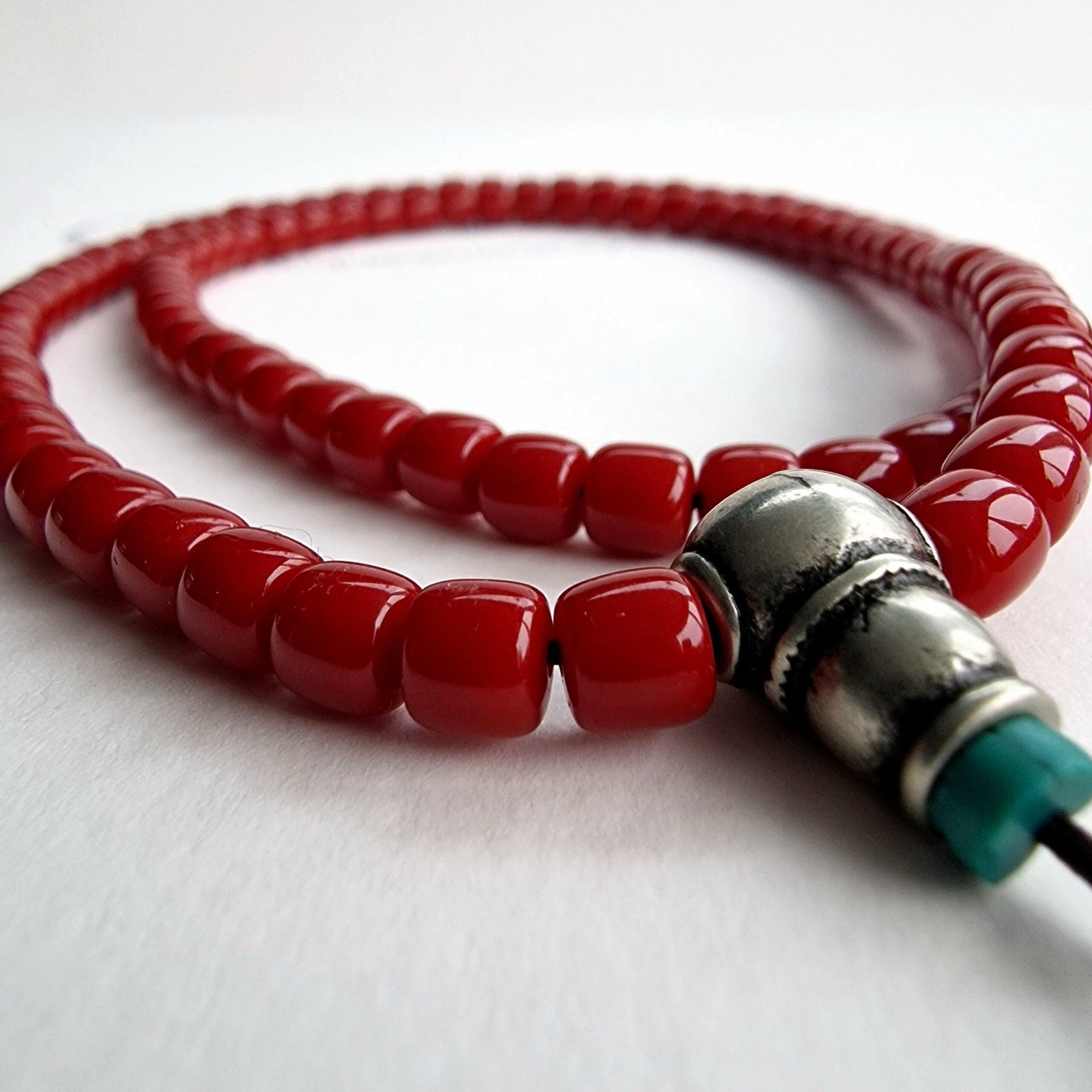 📿 Red Coral Tibetan Mala – 108 Beads with White Copper Guru & Turquoise