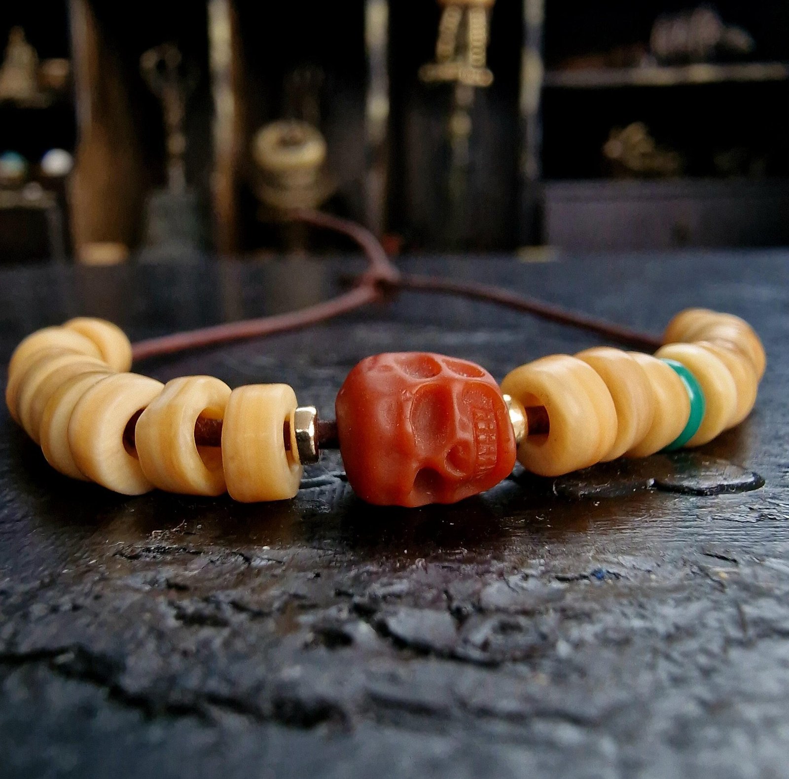 * Material: Sacred + hand-carved red agate skull, gold-filled spacers, antique Tibetan turquoise, leather cord.