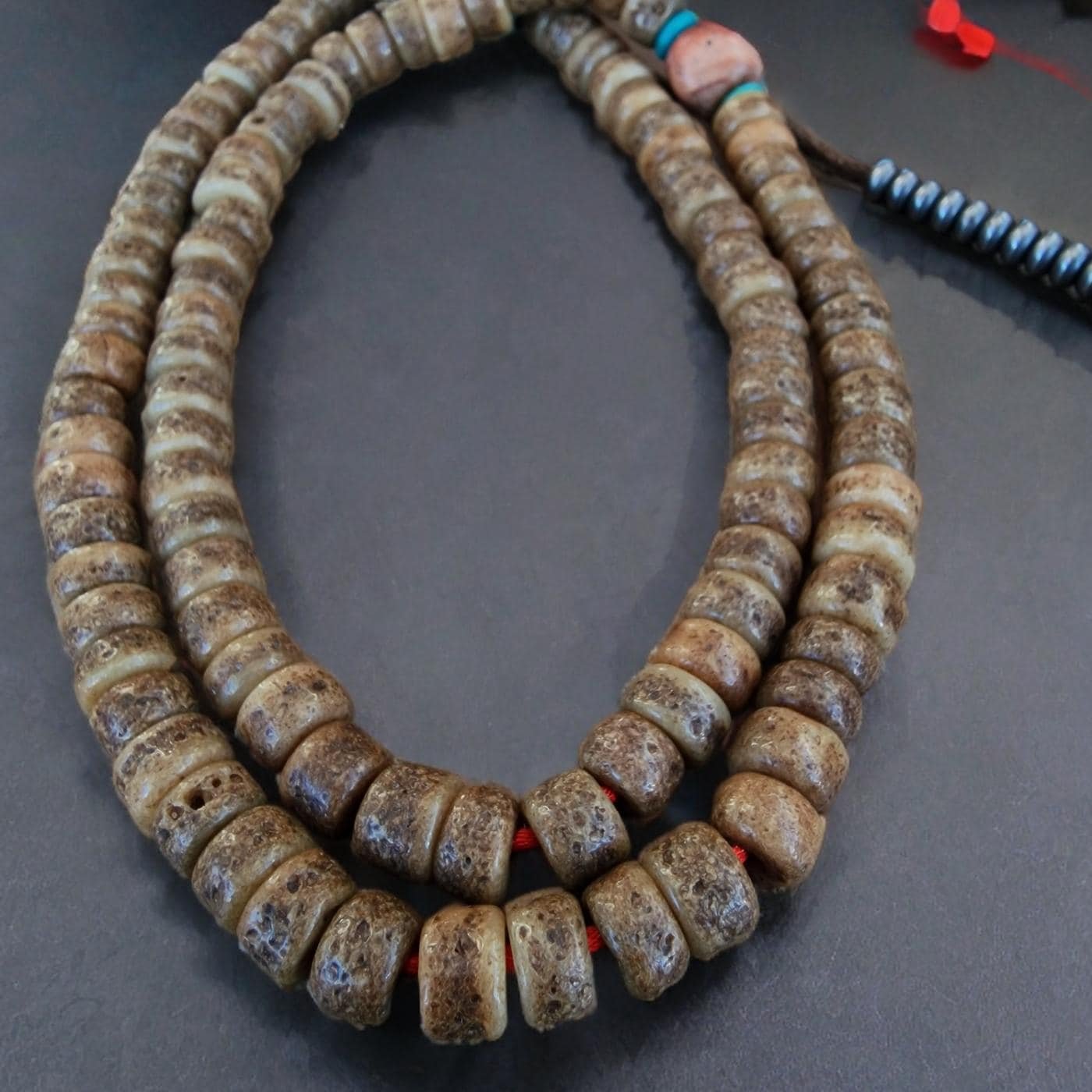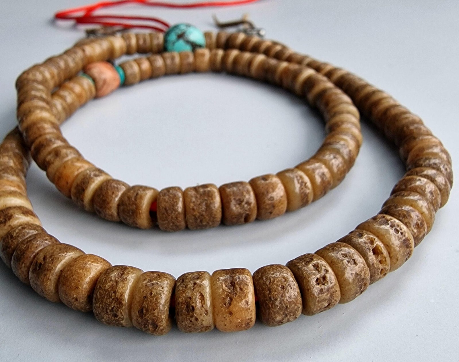 During meditation, the tactile sensation of bone beads serves as a constant reminder of the teachings — grounding the practitioner in presence and awareness. The irregular shapes encourage attention rather than mechanical repetition.