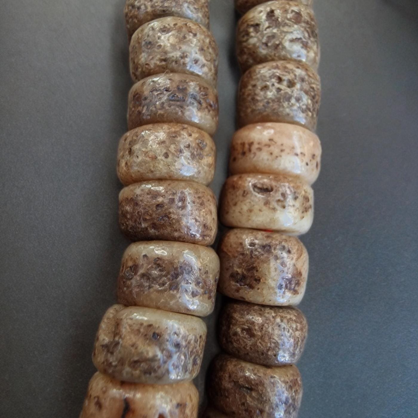 An early 20th-century Kapala prayer beads mala, traditionally made from H skull bone, used in advanced Tibetan Buddhist practice. The material shows a deep, natural patina developed through long use in a dry Himalayan climate, with no holes or weakness to the structure.