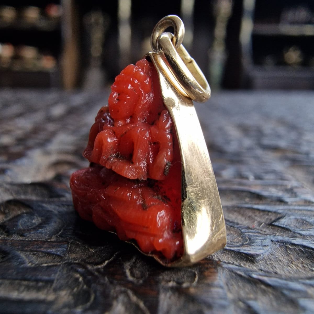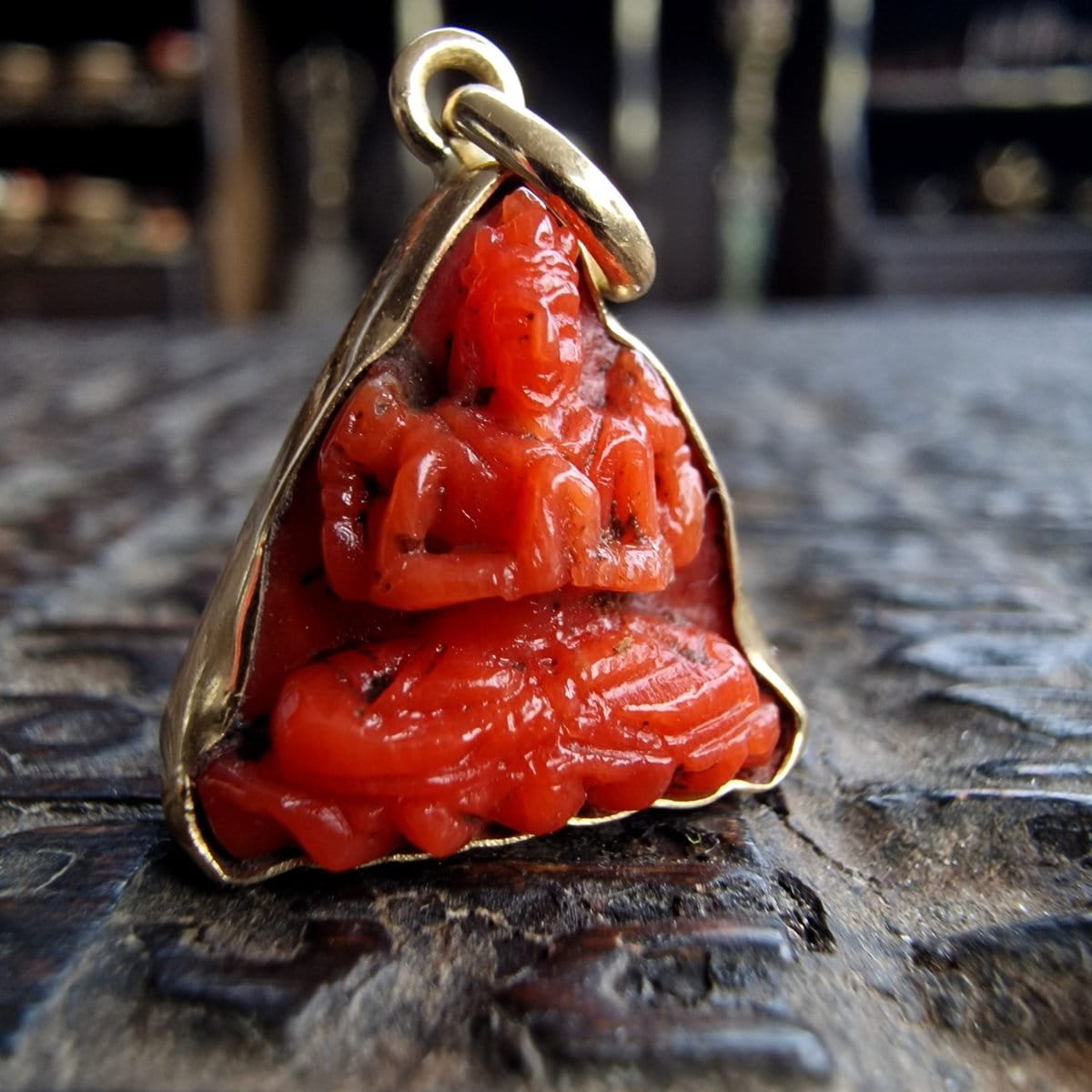 Material: Natural red coral bead (hand-carved intaglio), 18ct gold frame