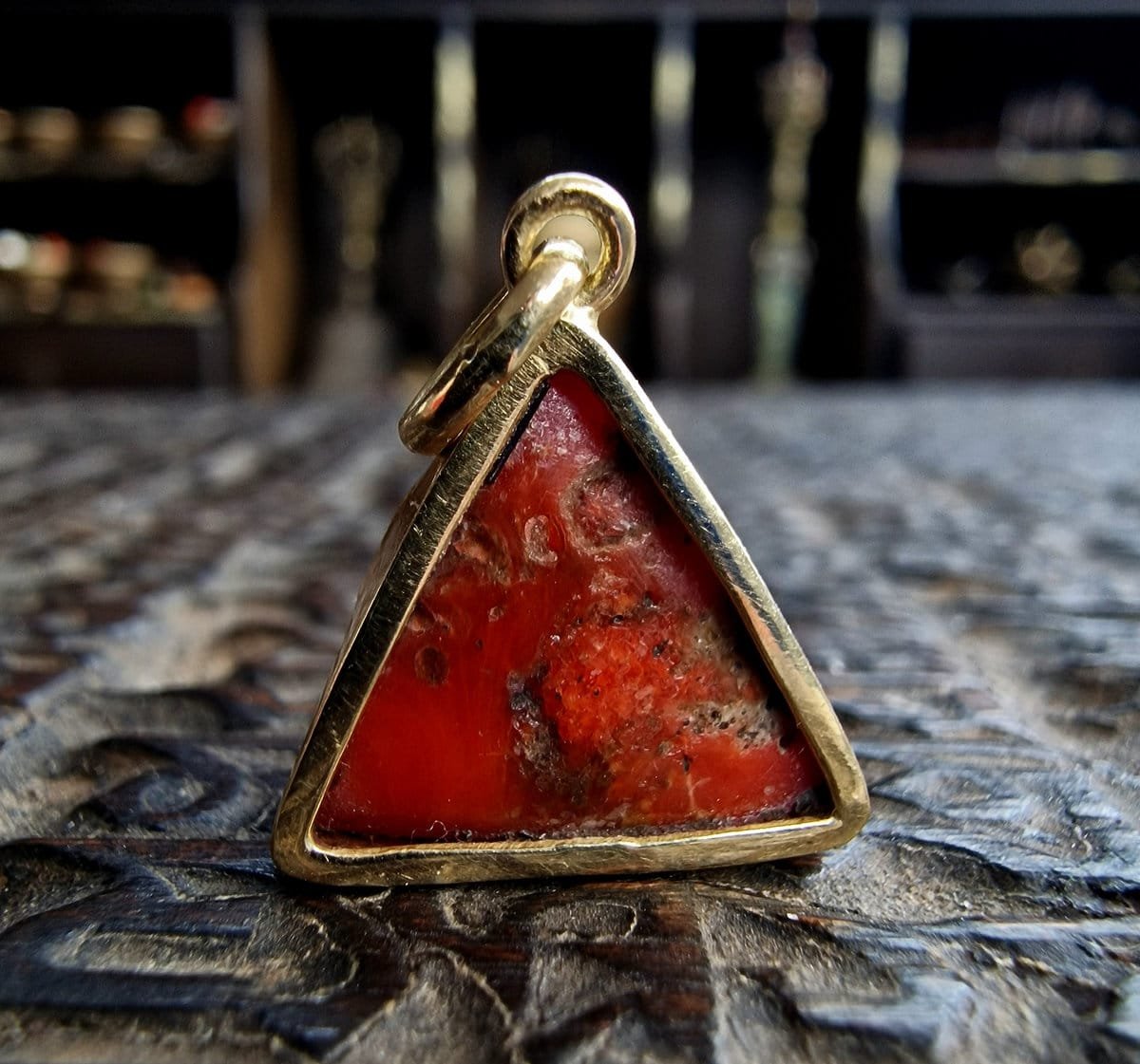 Warm visual contrast between antique coral bead and high-purity gold.