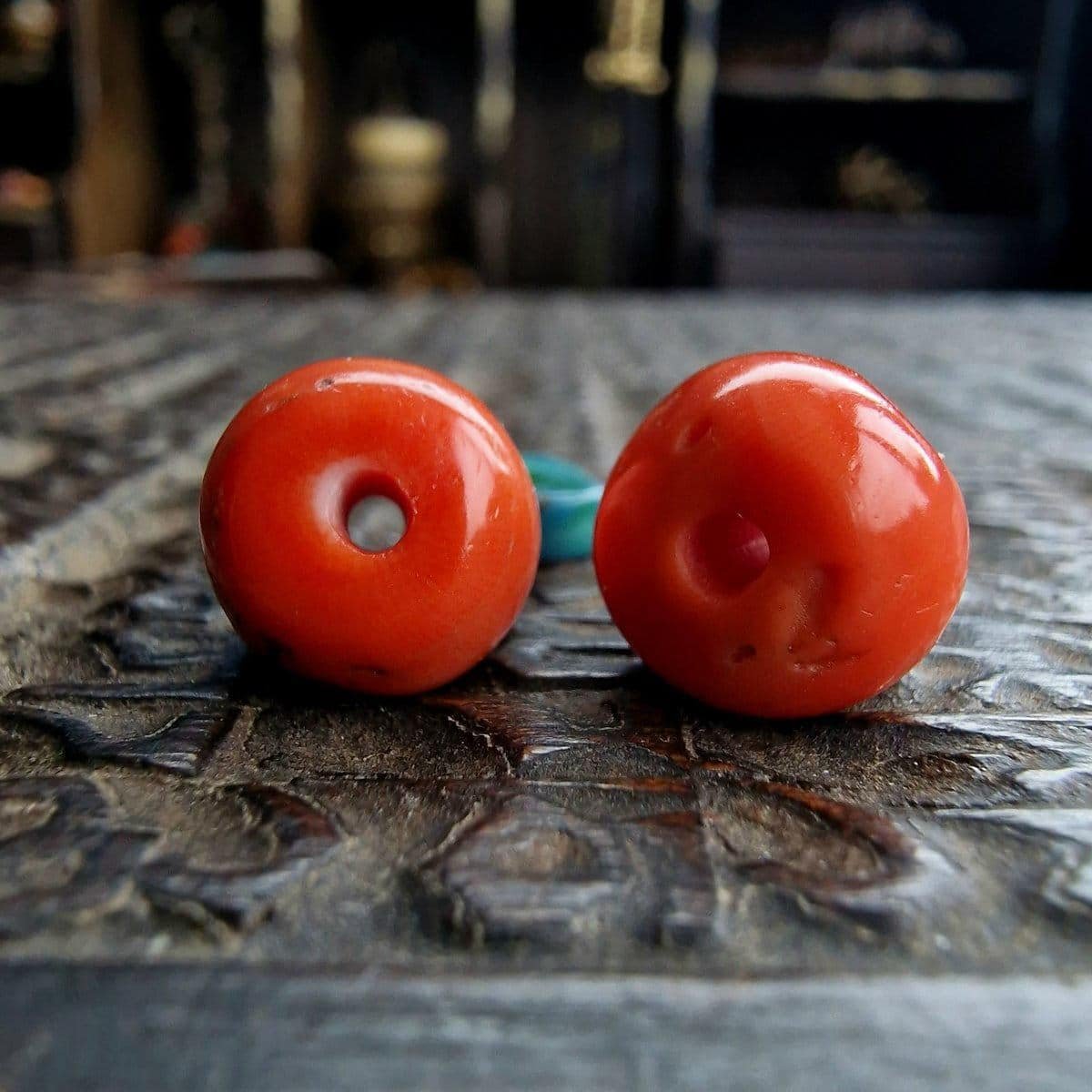 Rare 19th-century Tibetan momo coral bead, 11mm, 3.9g. High-density coral with turquoise center spacer. Drum-shaped, collected in Tibet. Superb patina, rare collectible bead with spiritual and cultural significance.