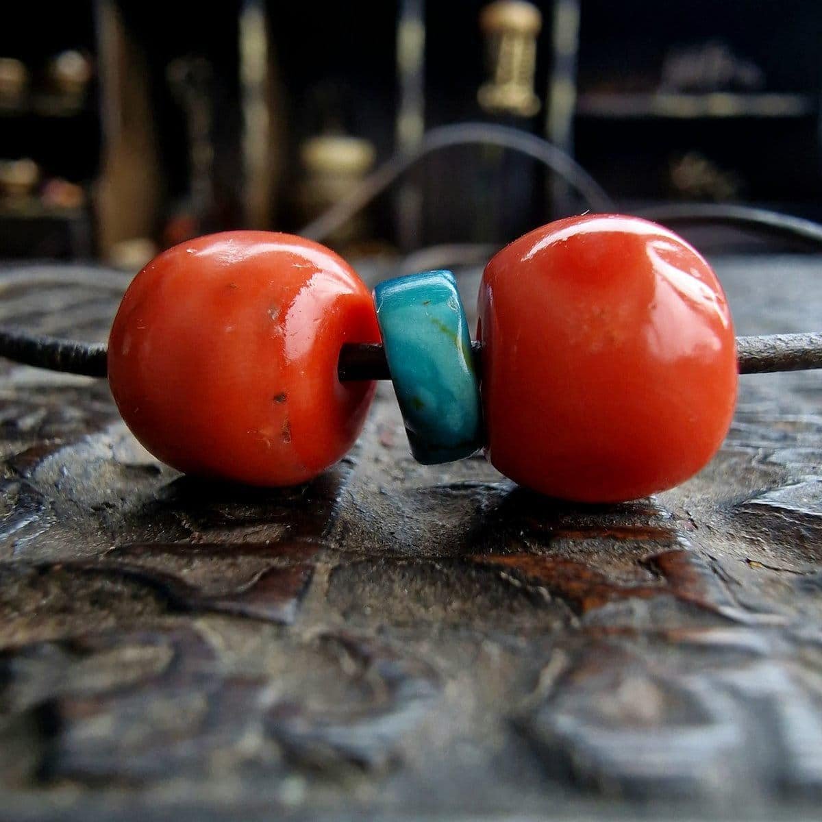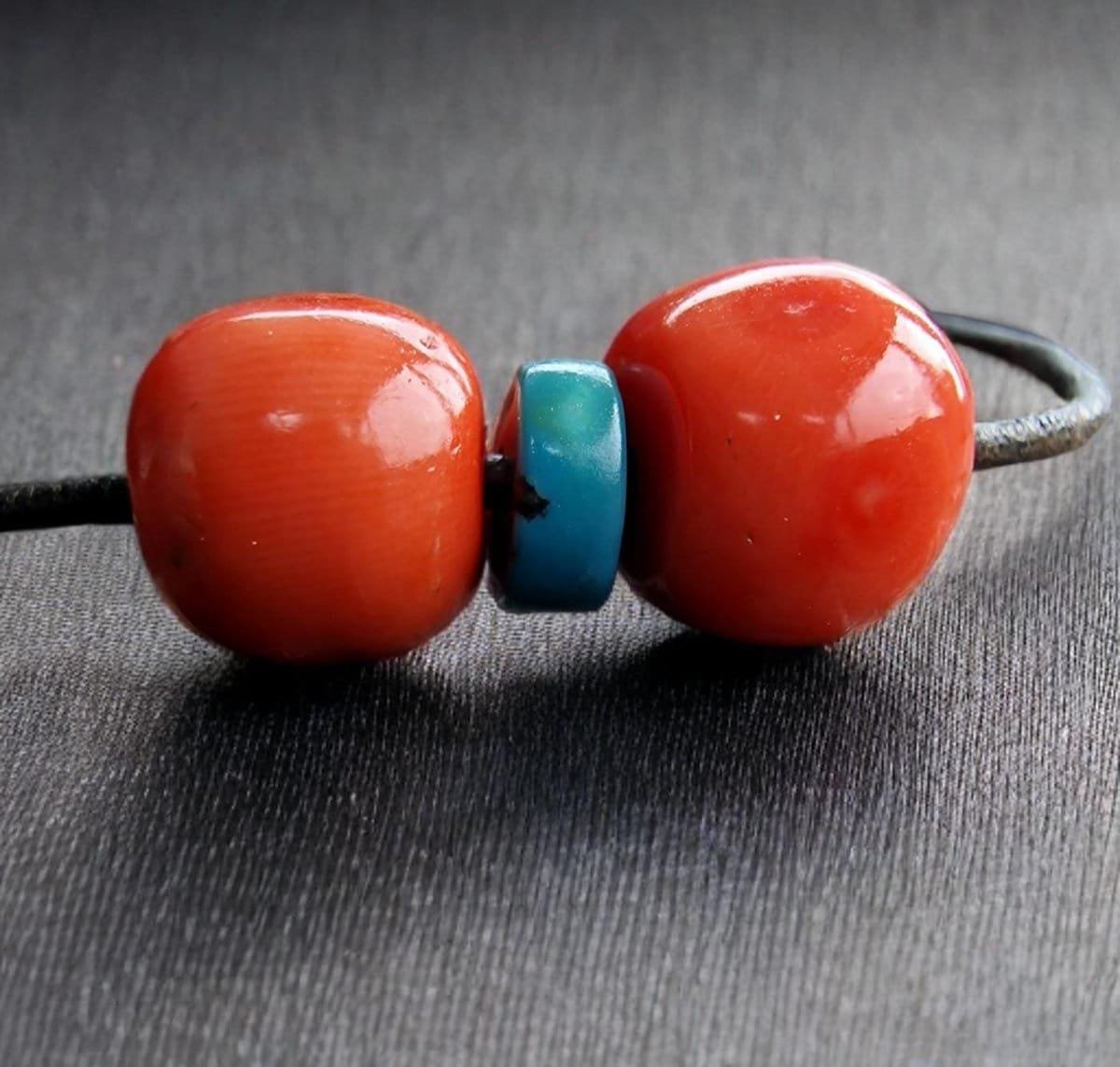 This bead originates from Tibet and dates back to the 19th century. Momo coral was highly prized in Himalayan regions for its deep red hue, durability, and protective qualities. The inclusion of a turquoise spacer bead highlights the traditional Tibetan practice of combining coral and turquoise—two of the most sacred stones in Tibetan culture.