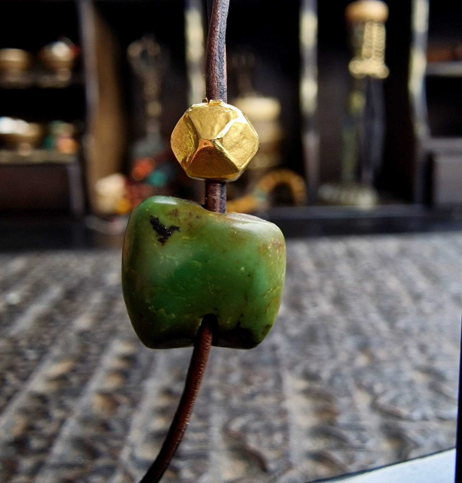 Unlike modern turquoise, this bead is not stabilized, dyed, or reconstituted — its colour, matrix, and energy are entirely natural, reflecting centuries of handling, devotion, and blessing.