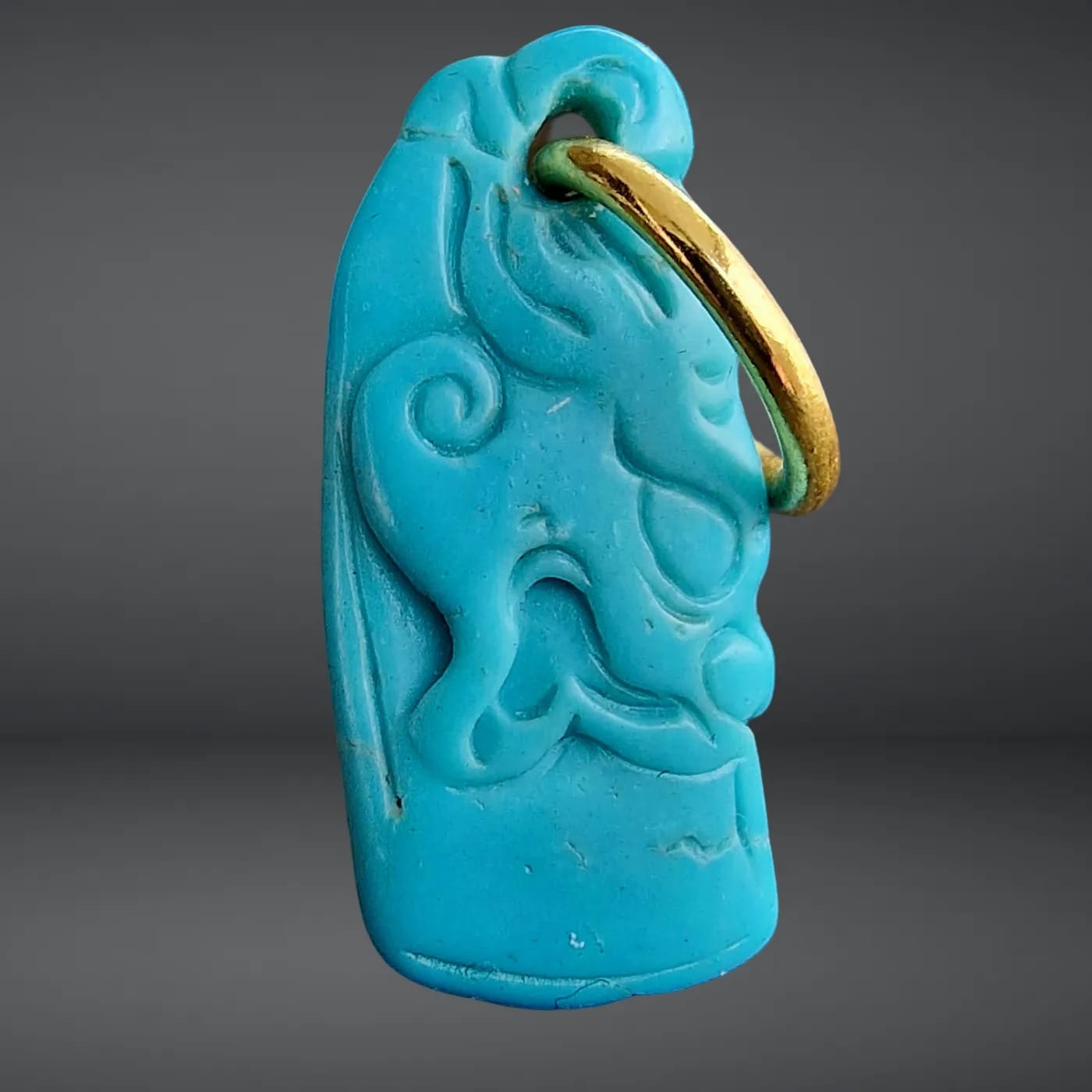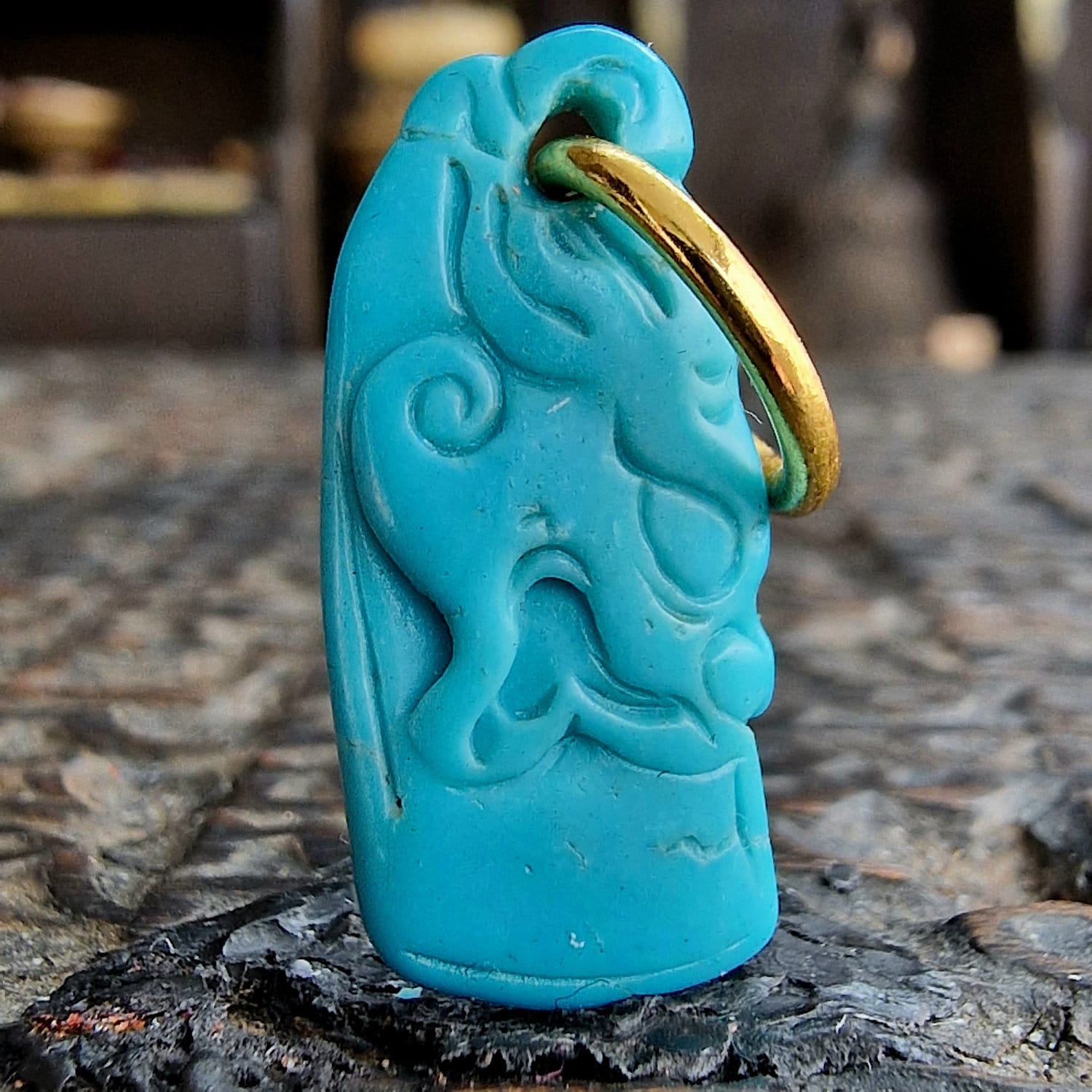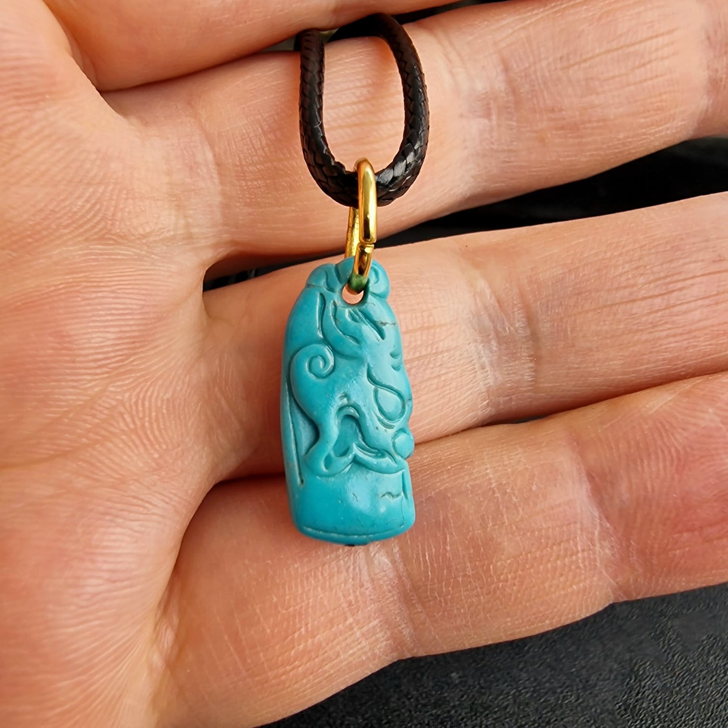 Carved from genuine turquoise, a stone held in high regard for millennia. In many traditions, turquoise is considered a bridge between heaven and earth, prized for its ability to provide protection and clear communication. Its deep teal hue is associated with the heart and throat chakras, believed to bring a sense of calm and emotional balance to the wearer.