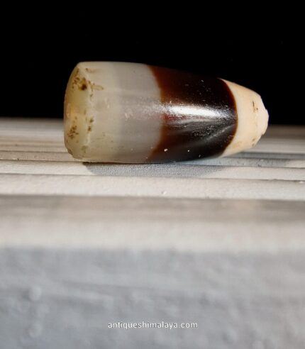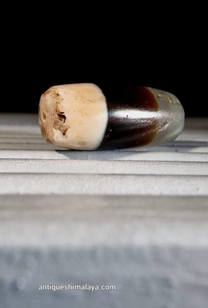 It is opaque, with a light brown Colour and an creamy decoration. Decoration is of superb quality and perfectly preserved, continuous all around the ancients dzi beads; that is rarely foundÂ