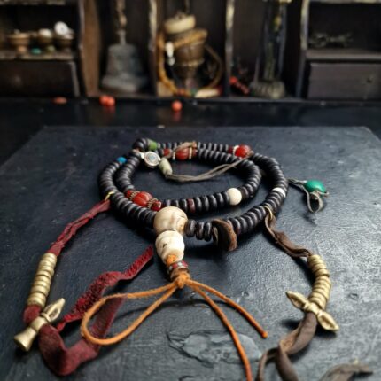 Symbolism and Use ◇ A Bodhi mala is a central tool in Tibetan Buddhist practice, used for counting mantra recitations. The many added beads and amulets each carry their own meaning—coral for life force, turquoise for protection, and the Kapala and Chitipati for reminders of impermanence. This mala is a powerful and sacred tool for personal practice.