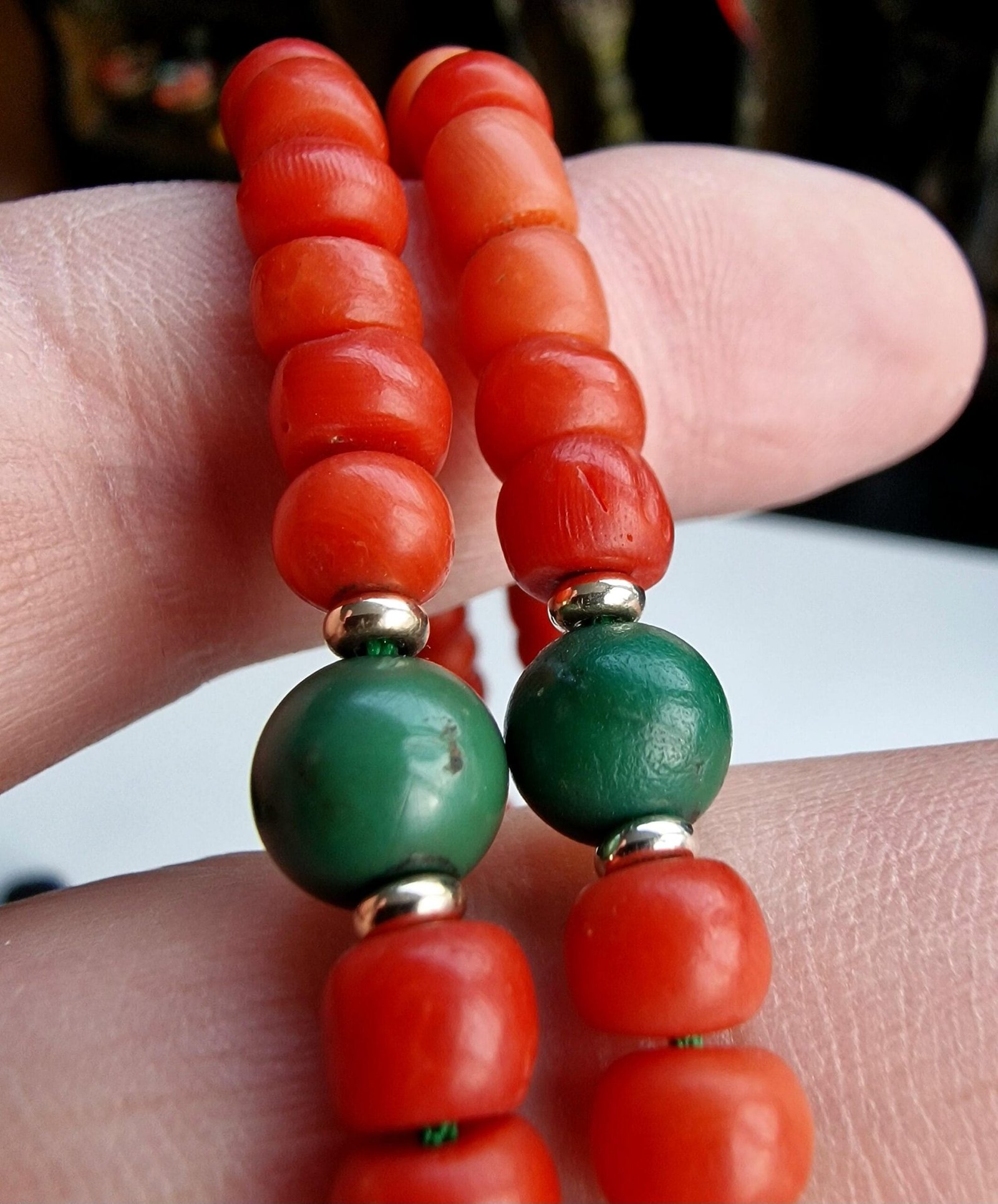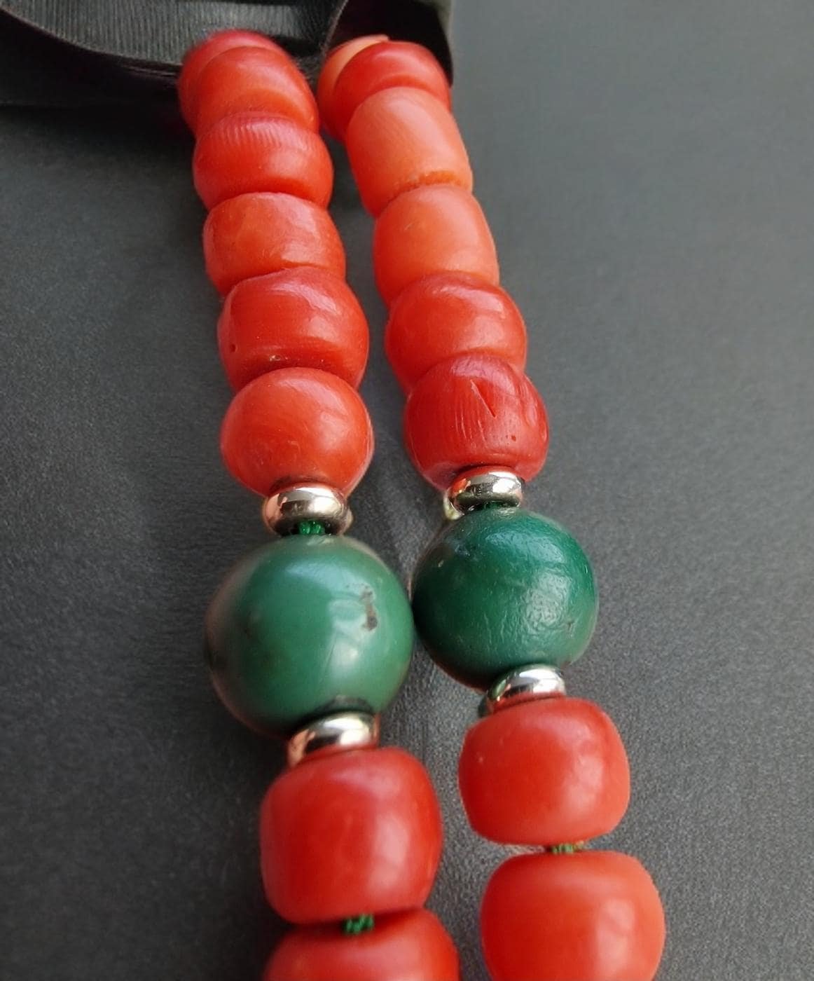 * The main strand is composed of natural red coral beads dating to the 19th century, exhibiting a rich, warm coloration and smooth, aged polish.