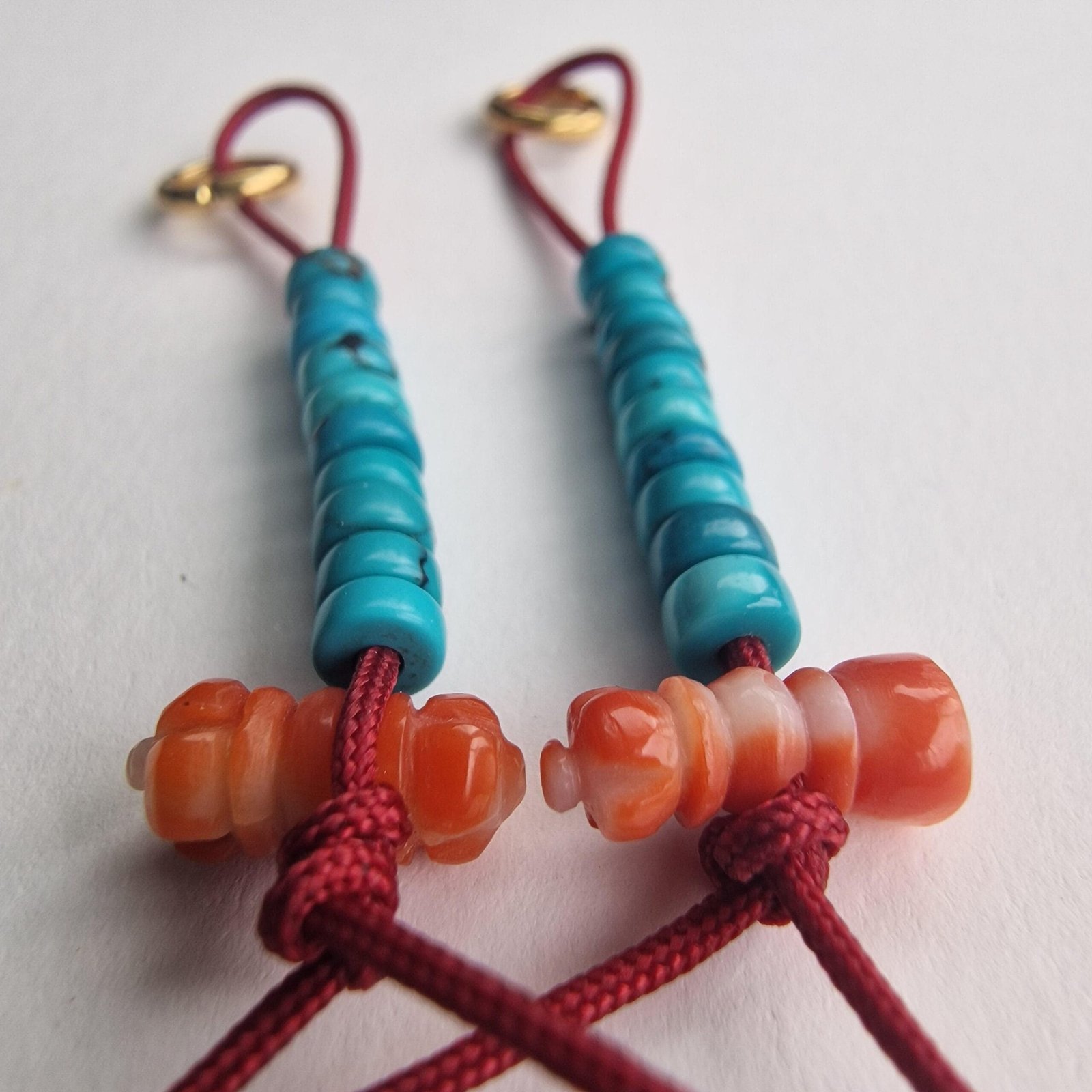 * The mala features natural coral and turquoise counters mounted on red cords with traditional gold plated spacers.
