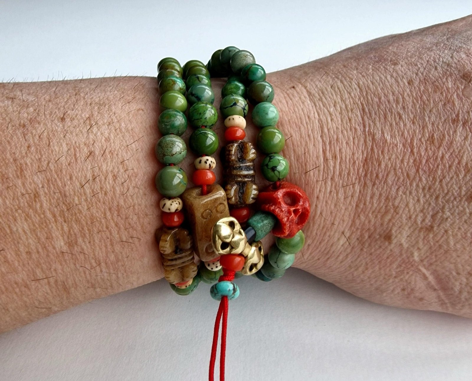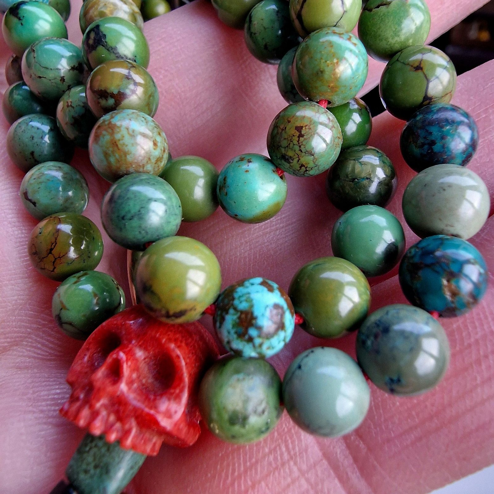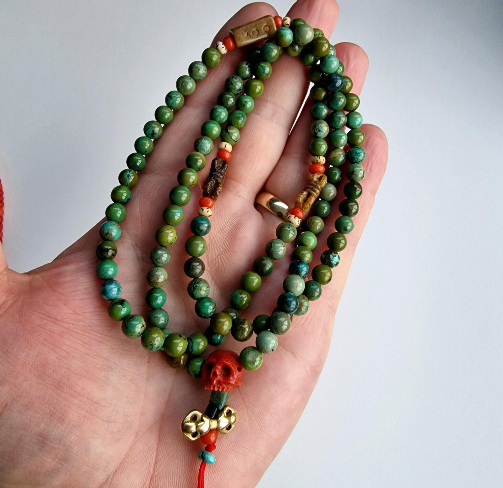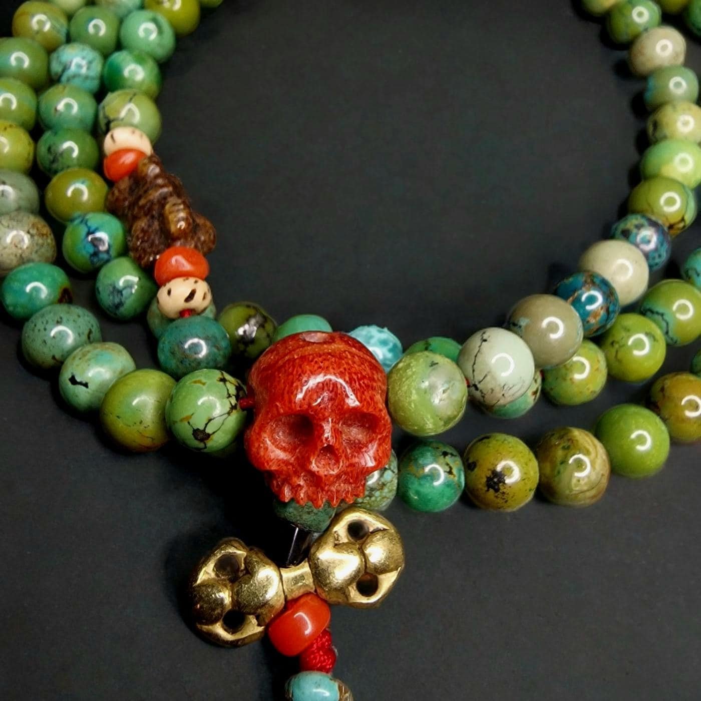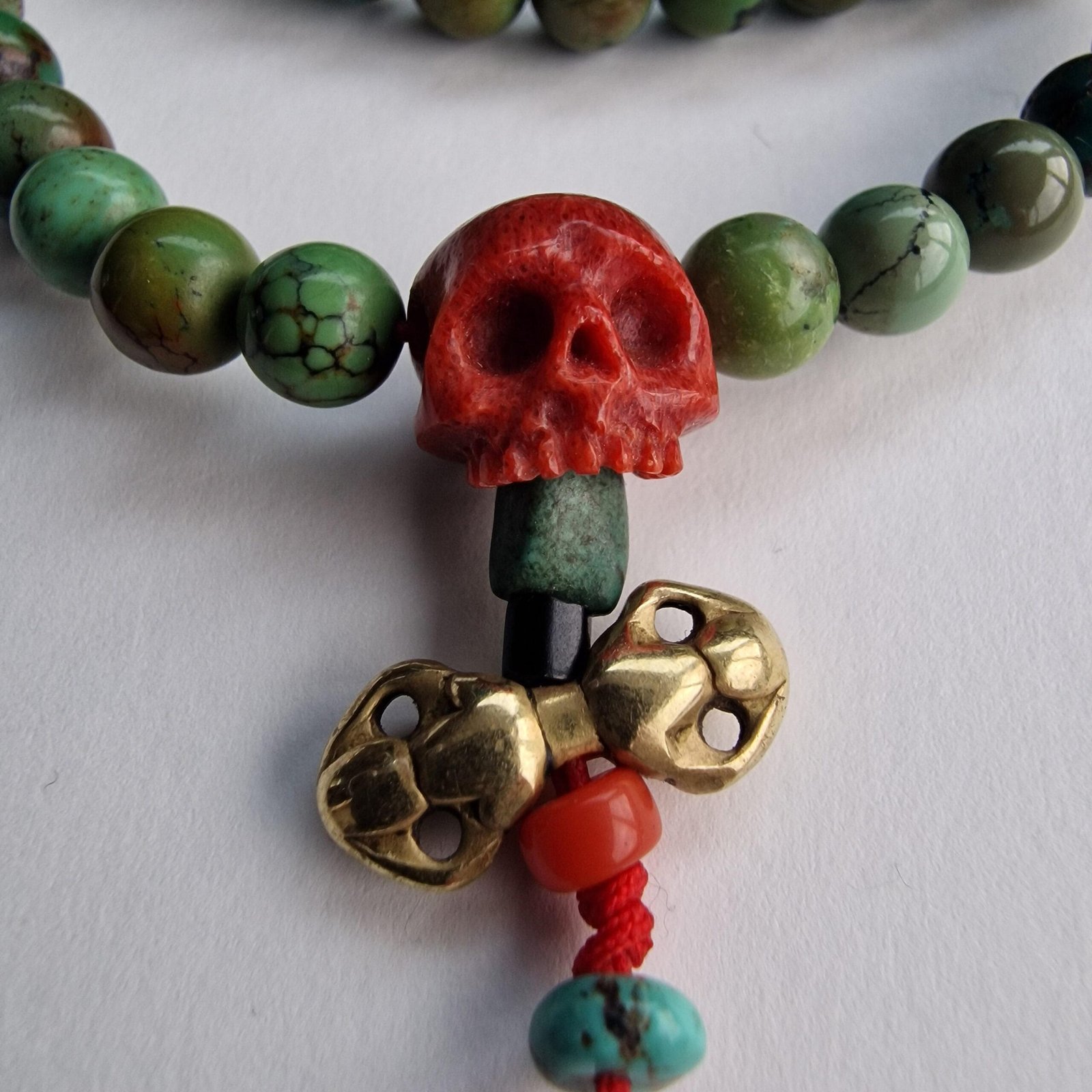 Styling Tips: This mala has a “monastic-chic” appearance. The contrast between the deep greens of the turquoise and the vivid red of the coral skull makes it a standout piece. It pairs excellently with dark, natural fibers like yak wool or heavy linen to let the complex textures of the bone and brass shine.