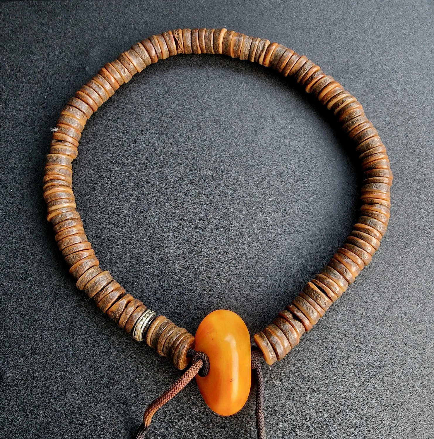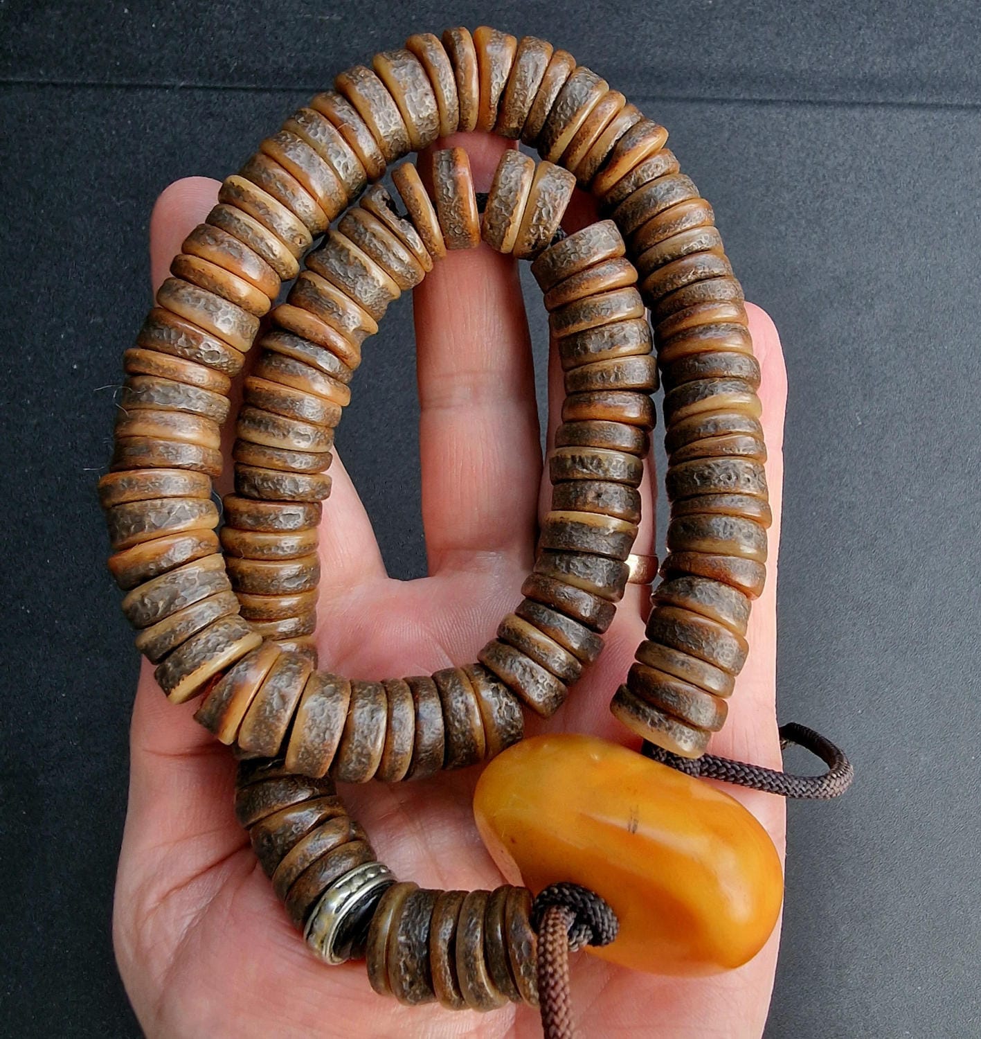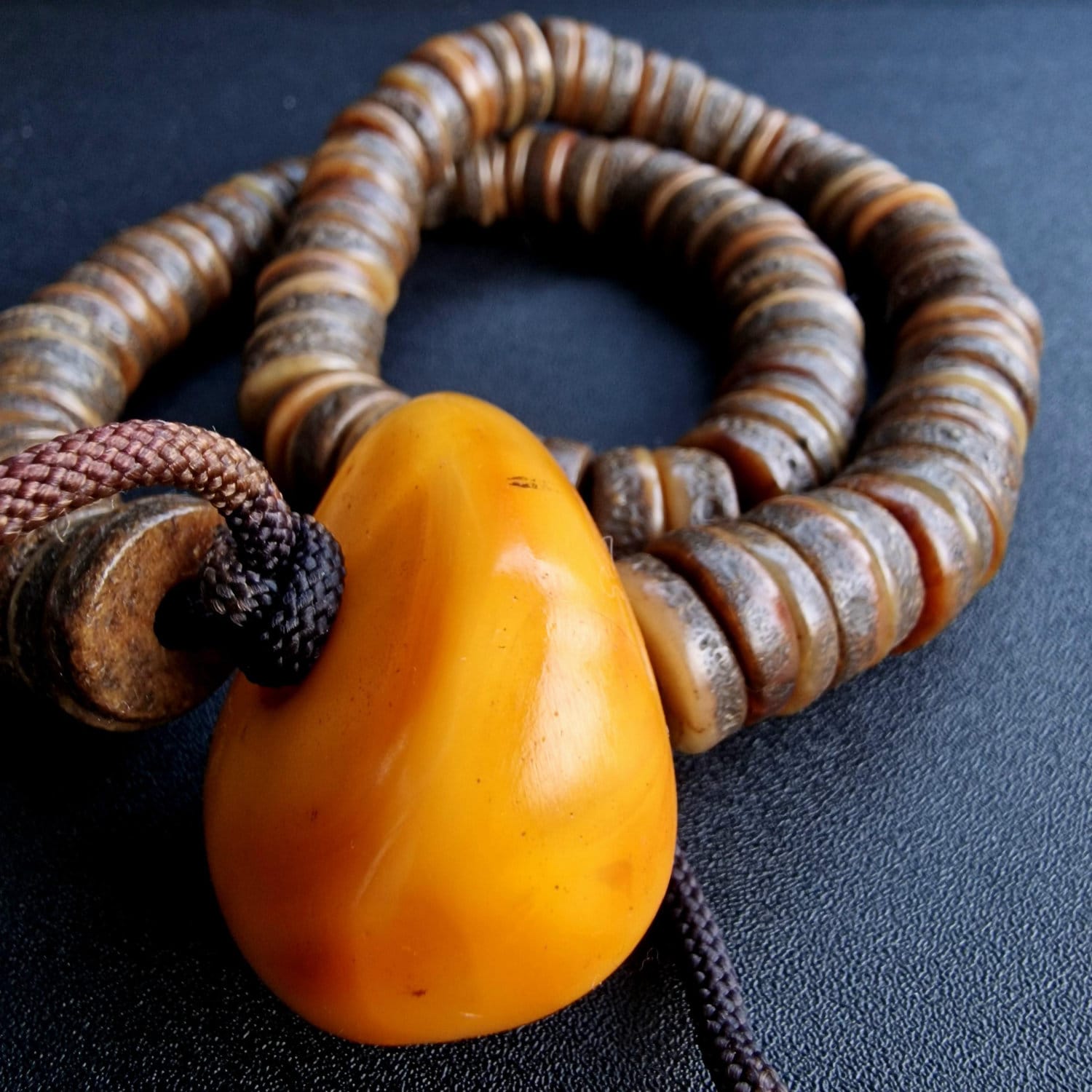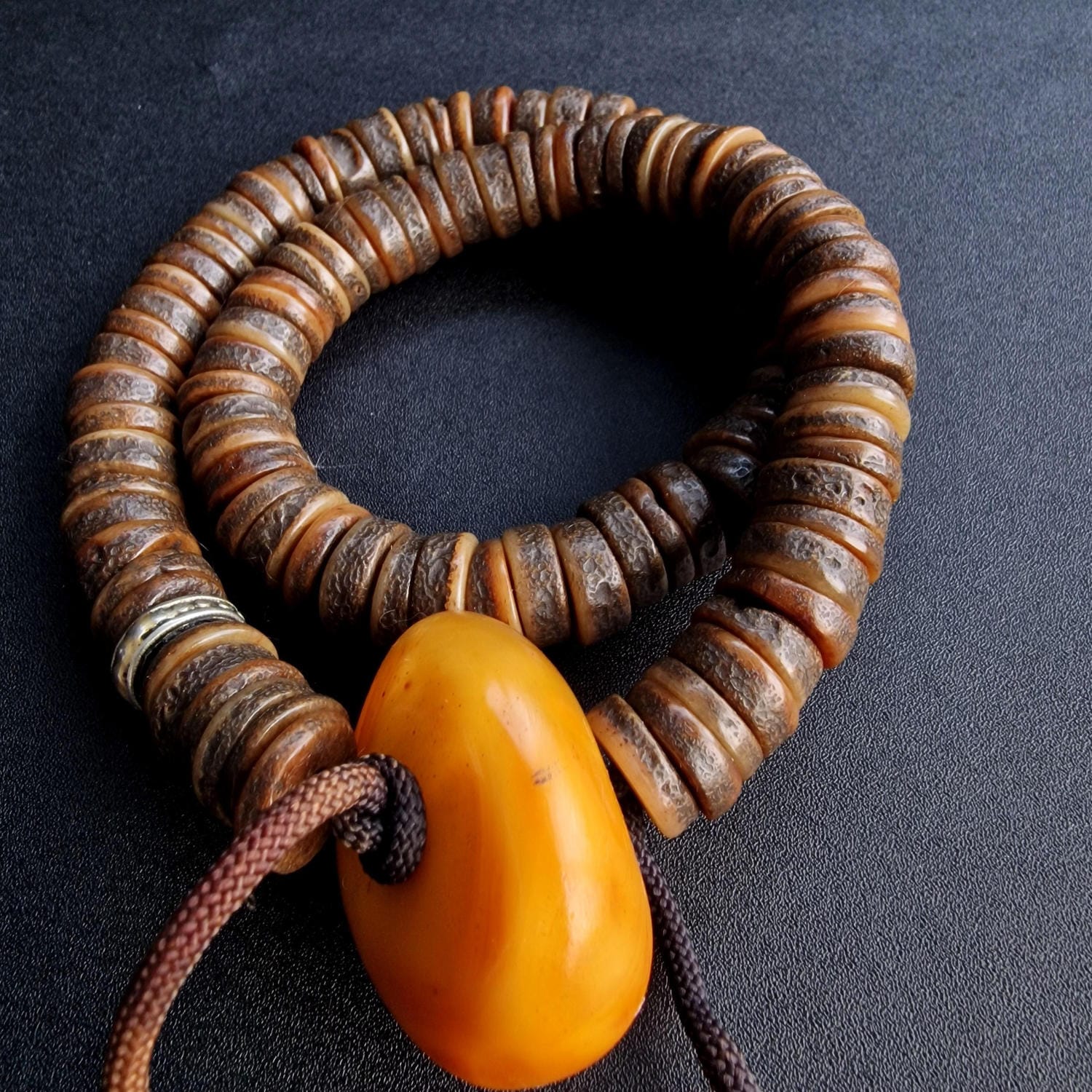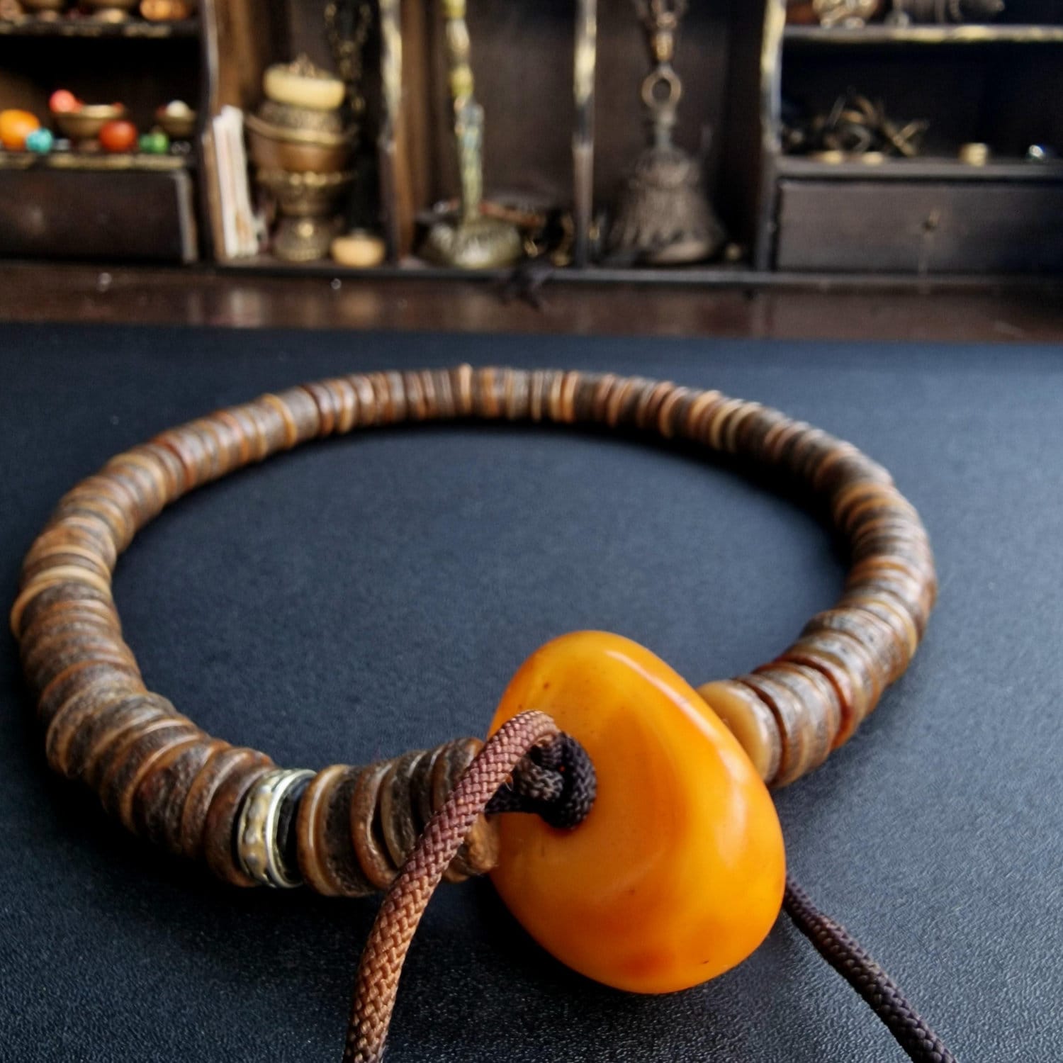 * The Aesthetic: It is living art—a transformative beauty that provides a quiet resting place for your attention during meditative moments. The contrast between the dark, seasoned relics and the glowing amber master bead perfectly captures the profound, elegant aesthetic of high-level Tibetan spiritual practice.