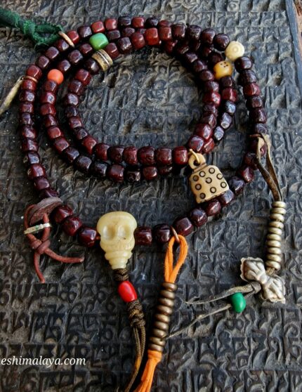 * Material: Rudraksha beads, skull Kapala, turquoise accent beads, Guru bead, and leather red cord.