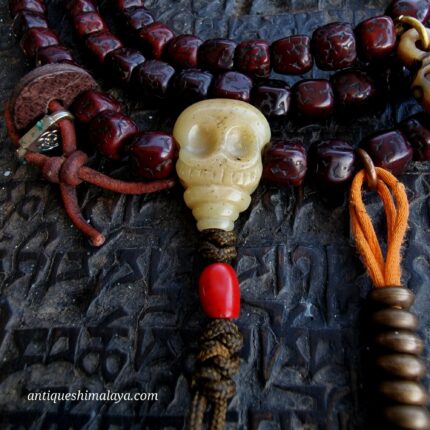 * Kapala (Skull) Spacer/Bead: The carved spacer bead, likely representing a Kapala or skull symbol, serves as a powerful reminder of impermanence (anitya). This juxtaposition encourages the practitioner to dedicate themselves to spiritual practice while alive.