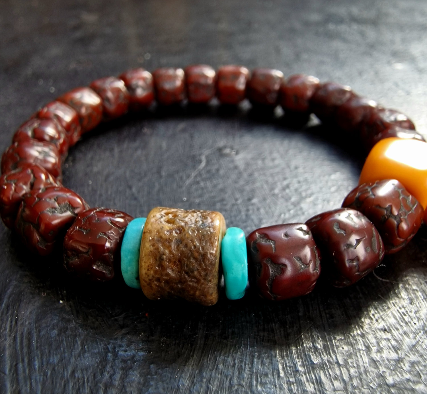◇ It features deep reddish-brown Rudraksha beads, accented by a carved spacer bead and bright turquoise.