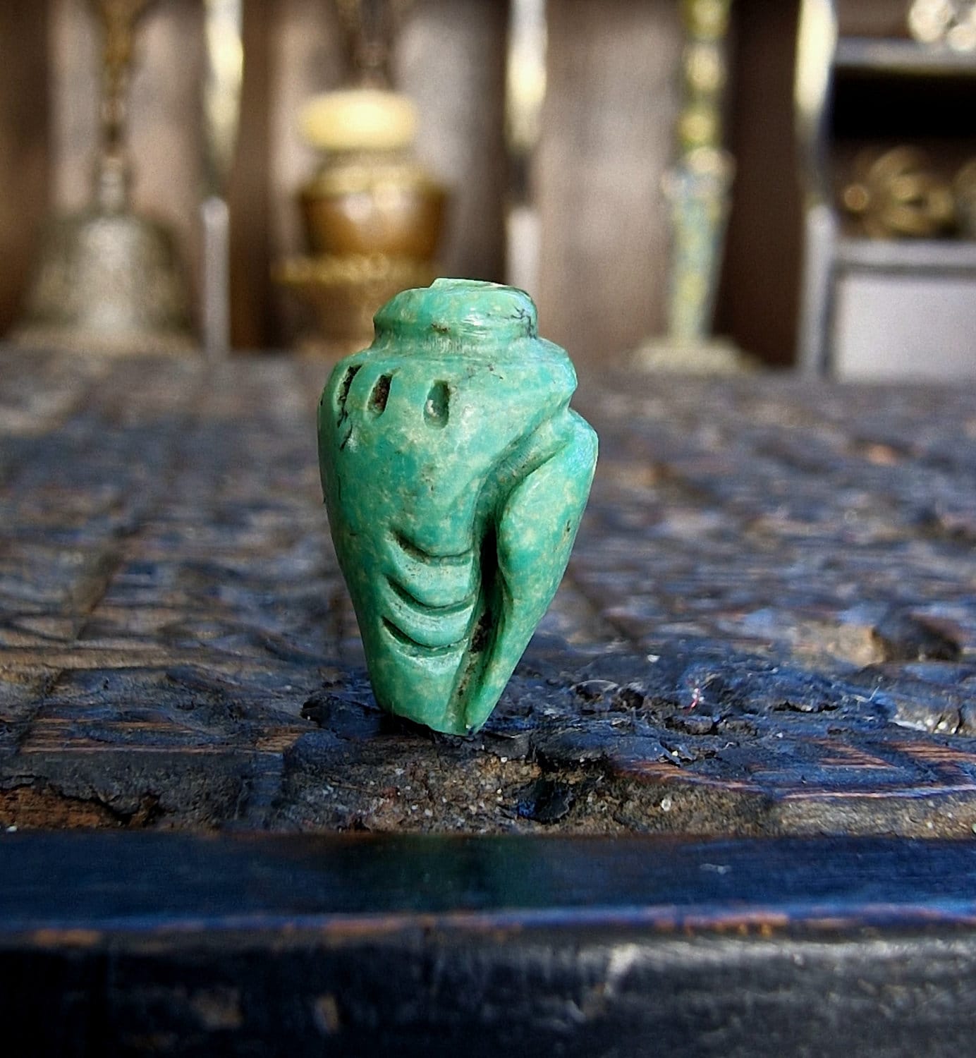 This is a small yet powerful hand-carved turquoise bead in the form of a conch shell, measuring 15mm x 10mm. The carving is stylized and robust, characteristic of early 20th-century Himalayan craftsmanship. The spiral and ridges of the shell are carved with deliberate precision into the natural stone. A longitudinal bore hole allows the piece to be integrated into a mala or worn as a single protective pendant.