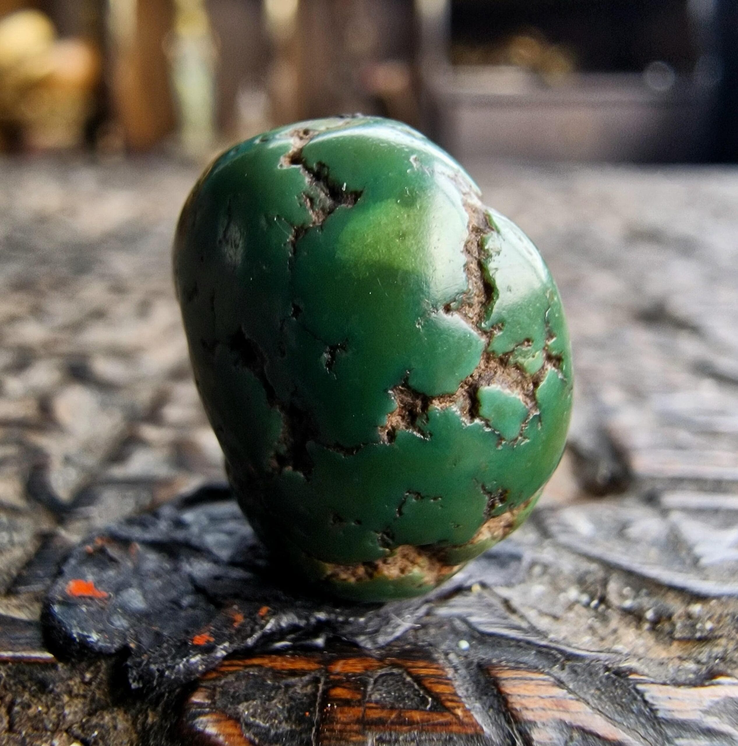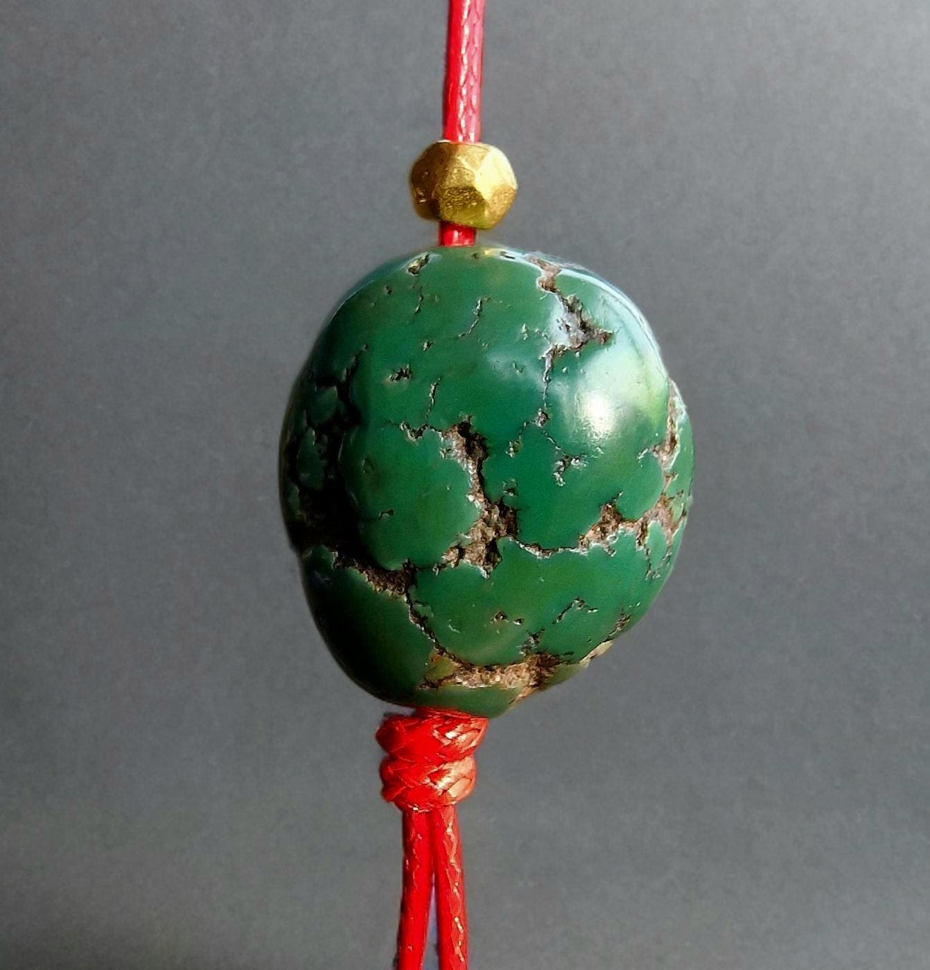* Museum-quality 17th-century Tibetan turquoise bead, exhibiting a high-density structure and a breathtaking deep green hue.
