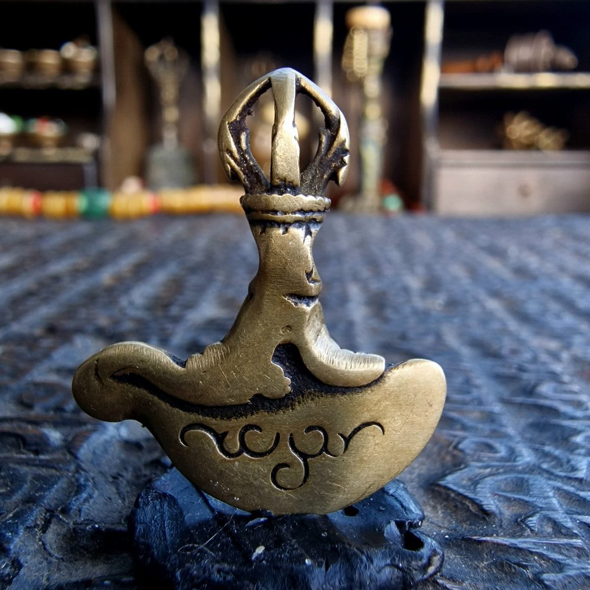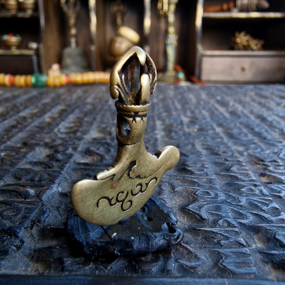 The Kartika (ritual flaying knife) is a symbol of wisdom cutting through ignorance, attachment, and illusion. In Tibetan Buddhism, it is often held by wrathful deities such as Vajrayogini and dakinis, representing liberation from samsara’s bonds. As a thogchag, it becomes a portable amulet, imbued with blessing and protective qualities.