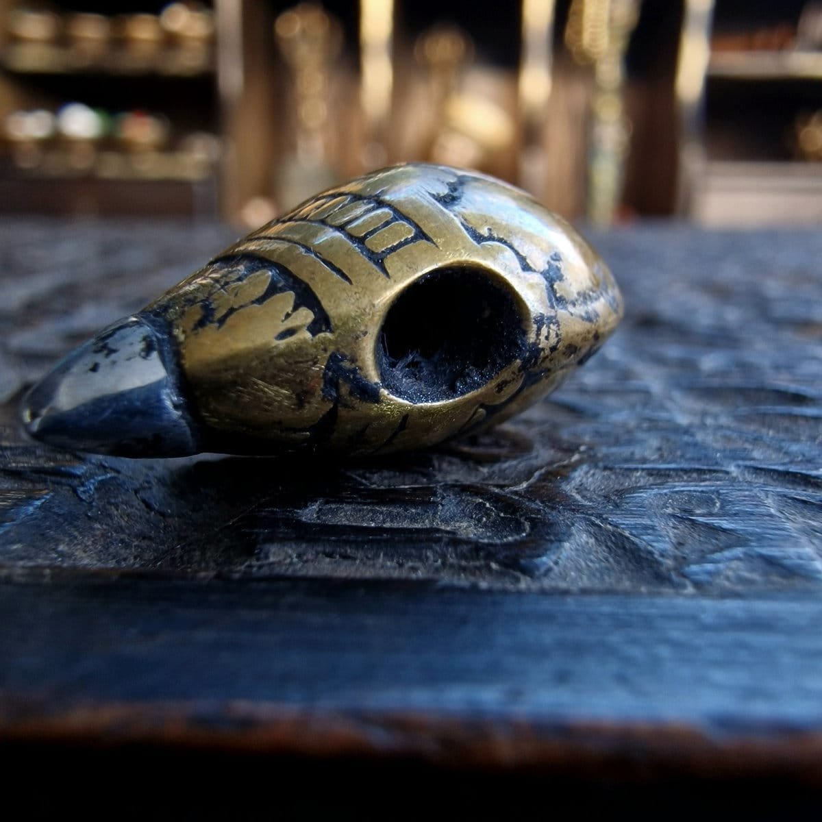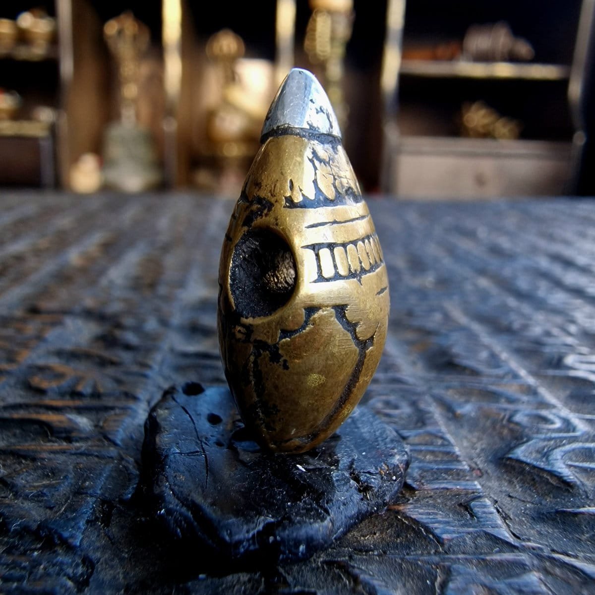 The stupa is a sacred architectural form embodying the awakened mind. In Tibetan Buddhism, it symbolizes the five elements and the presence of the enlightened state. Amulets crafted in stupa form were believed to radiate blessings, protect the wearer, and connect them to the lineage of the Dharma.