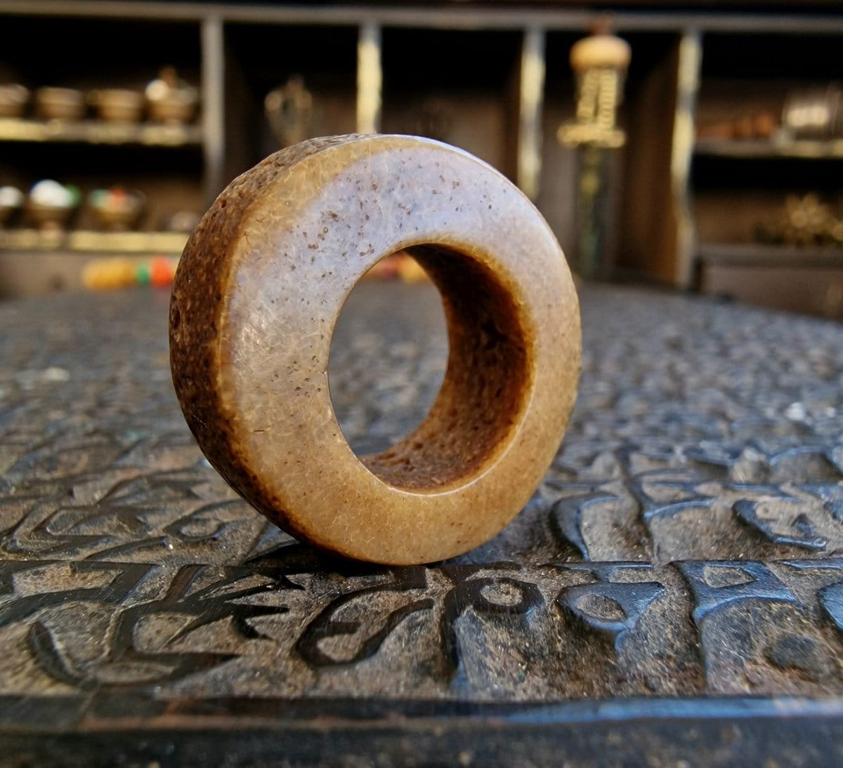 This Kapala yogi ring originates from Tibet and dates to the 19th century. Crafted from lama skull bone, it was collected from a Tibetan lama. Such ritual rings were traditionally used by Himalayan yogis as meditation tools and protective amulets.Cultural & Spiritual Significance