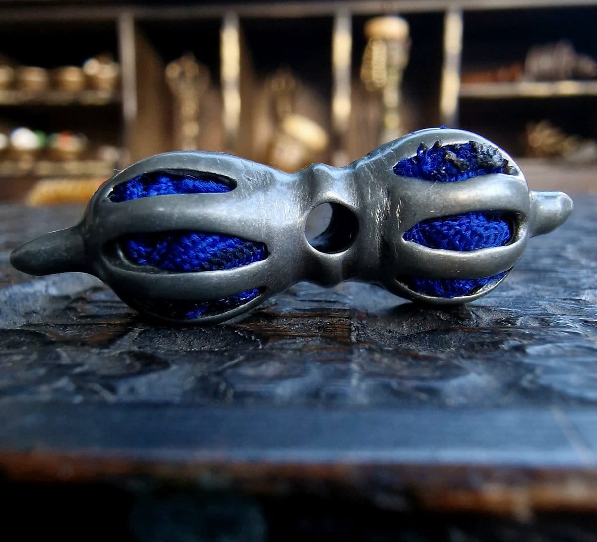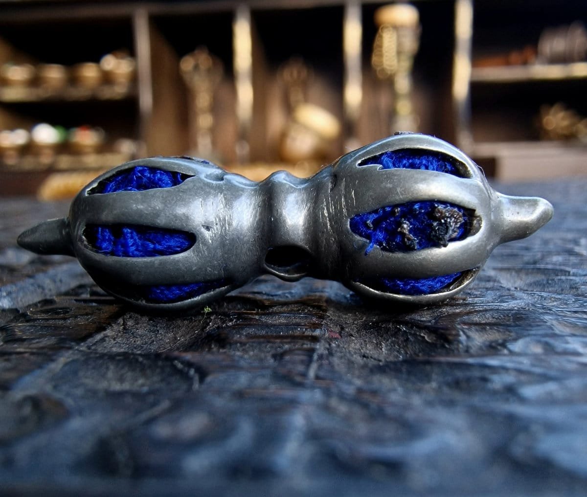 The vajra is one of the most powerful symbols in Tibetan Buddhism, representing indestructibility, spiritual strength, and the thunderbolt of enlightenment. This particular thogchag is consecrated with an inner prayer flag, enhancing its protective and spiritual power.