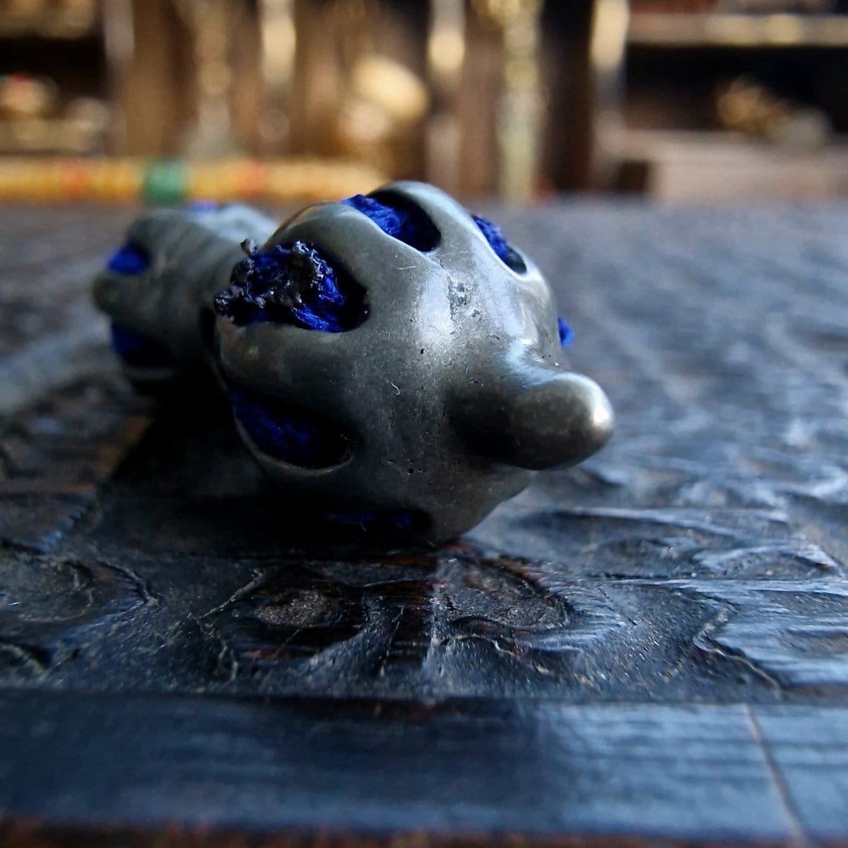 This antique vajra thogchag, measuring 36 × 12 mm, originates from Nepal and is crafted from white copper. Thogchags are sacred metal objects traditionally worn as amulets, often associated with Tibetan and Himalayan spiritual practice.