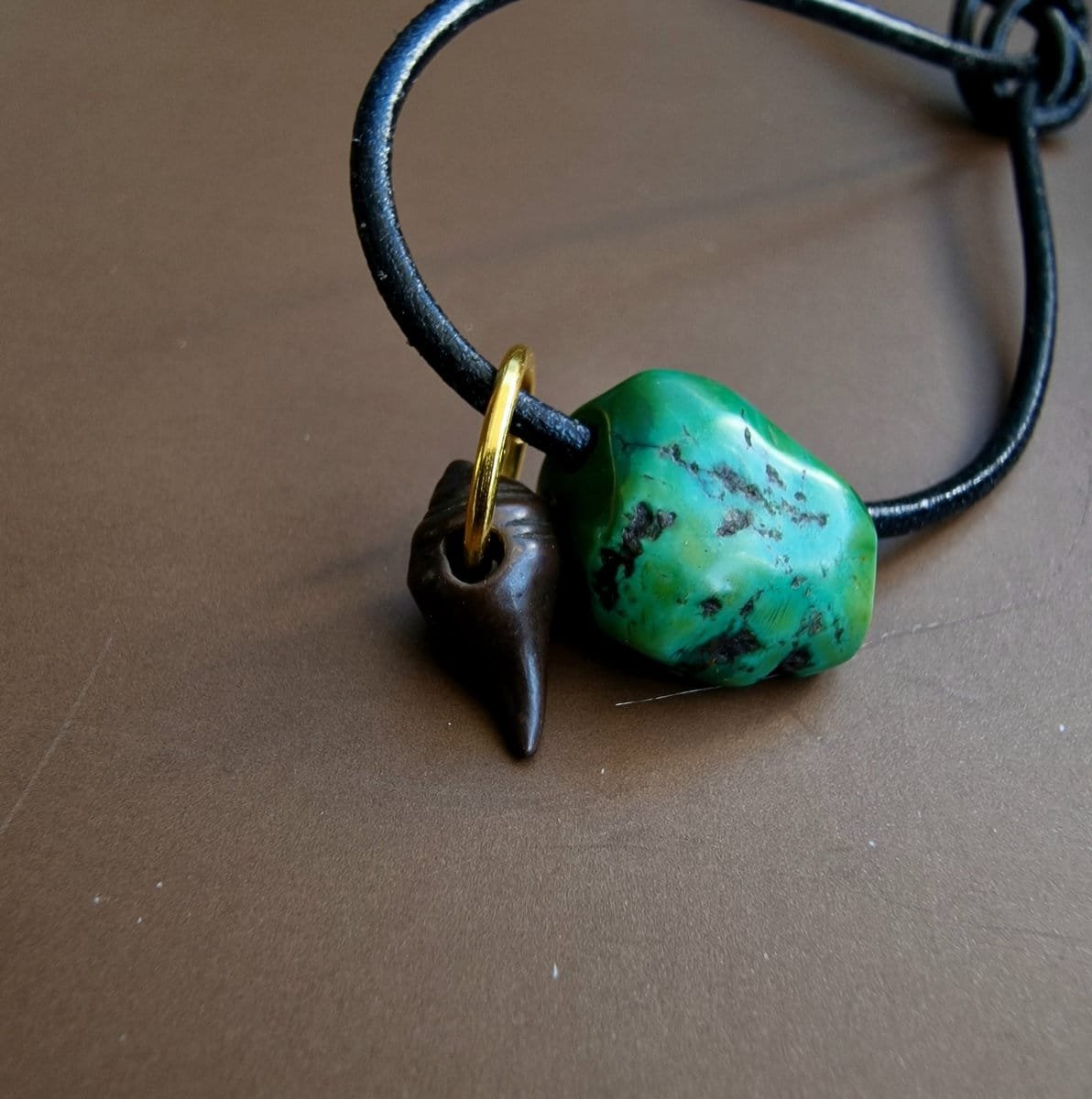 Rare Tibetan amulet with 500-year-old turquoise and copper alloy thogchag. Collected in Tibet, with authentic patina and natural signs of age. Highly collectible, spiritually powerful, and ready to wear on a black leather string.